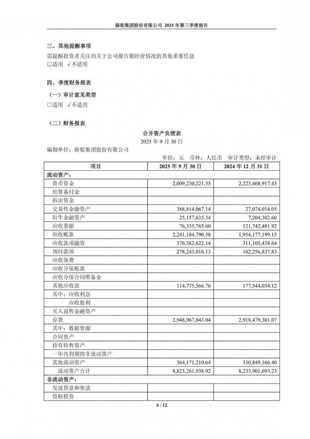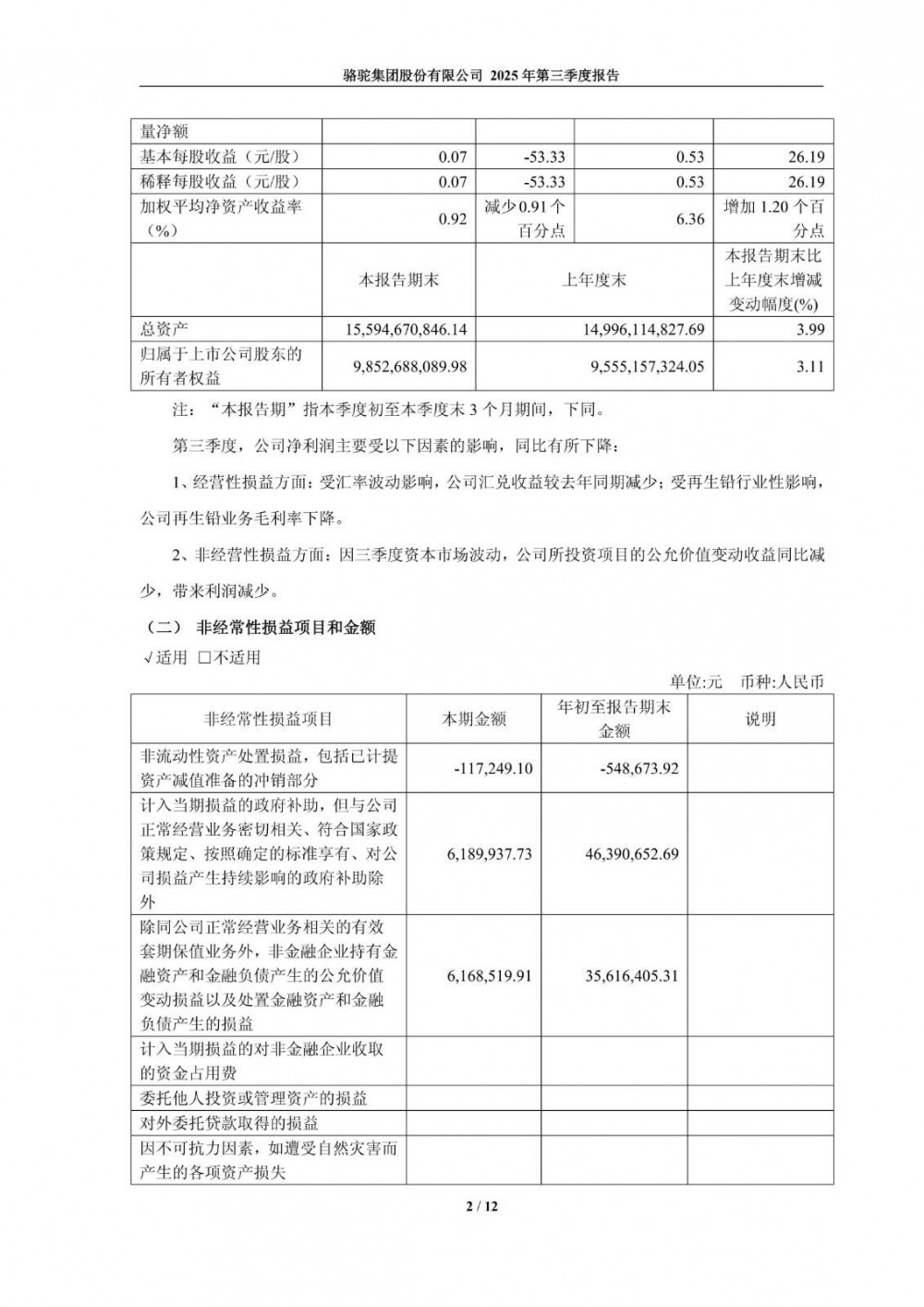 近日,骆驼股份发布2025年第三季度报告。2025年第三季度,受益于铅酸电池出货量提升和低压锂电订单放量,公司实现营业收入约41.5亿元,同比增长8.95%;受再生铅行业竞争加剧、汇兑收益减少及公允价值变动等因素影响,短期利润承压。前三季度,归属于母公司股东的净利润约6.19亿元,同比增长26.95%;经营活动产生的现金流净额约2.66亿元,同比增长9278.8%,经营情况总体向好。