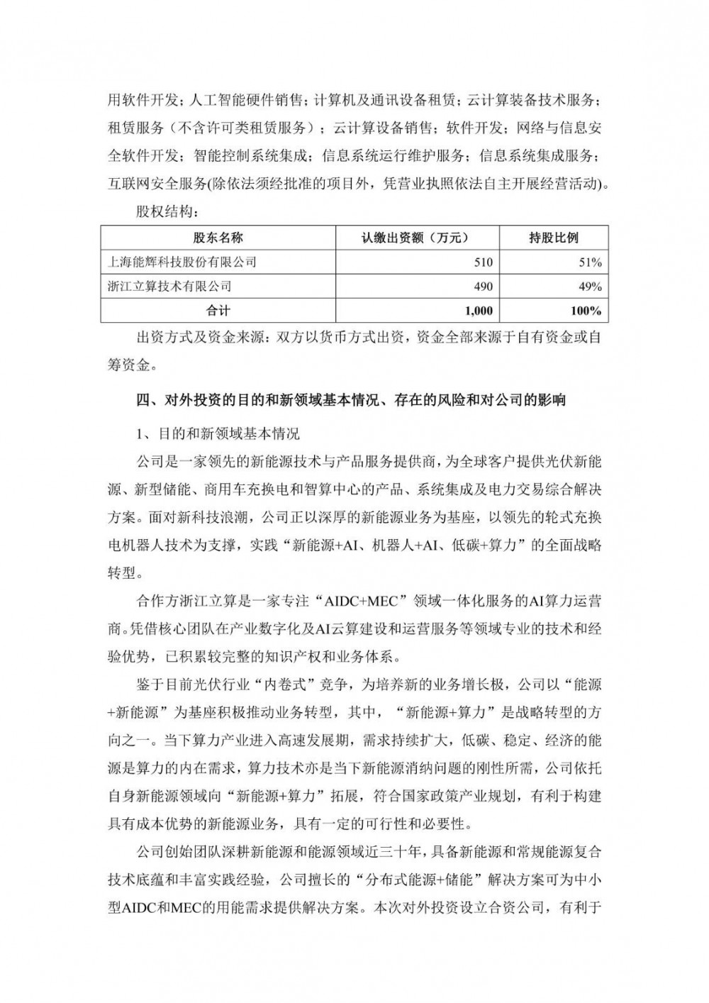能辉科技创始团队深耕新能源和能源领域近三十年,具备新能源和常规能源复合技术底蕴和丰富实践经验,公司擅长的“分布式能源+储能”解决方案可为中小型AIDC和MEC的用能需求提供解决方案。本次对外投资设立合资公司,有利于发挥双方在新能源与算力领域的技术与资源优势,实现协同发展,符合公司战略转型发展需要,对提高公司的核心竞争力具有积极影响。