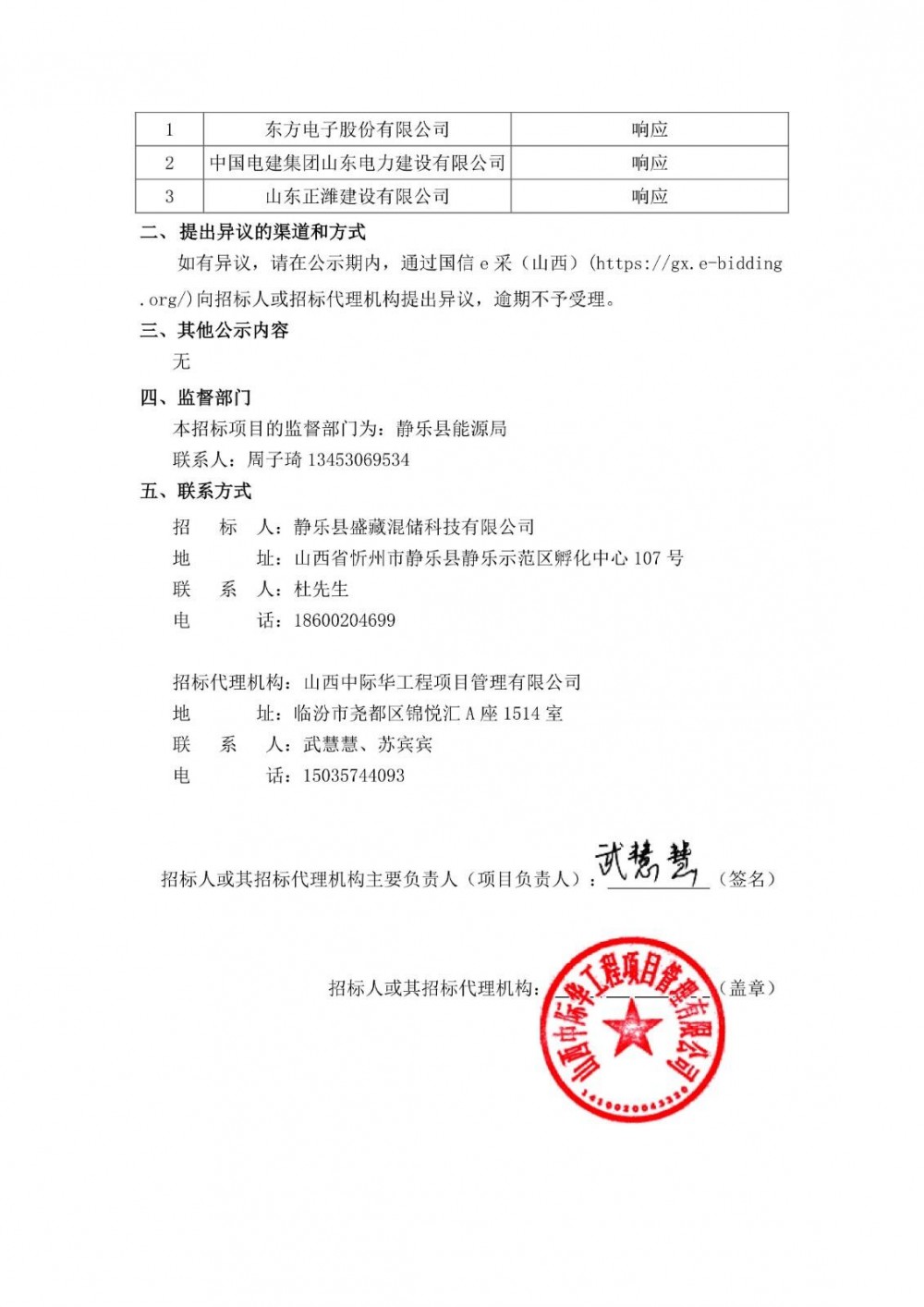 第一中标候选人为东方电子股份有限公司,报价323255000元,折合单价约1.61元/Wh;第二中标候选人为中国电建集团山东电力建设有限公司,报价347440000元,折合单价约1.73元/Wh;第三中标候选人为山东正潍建设有限公司,报价358146800元,折合单价约1.78元/Wh。