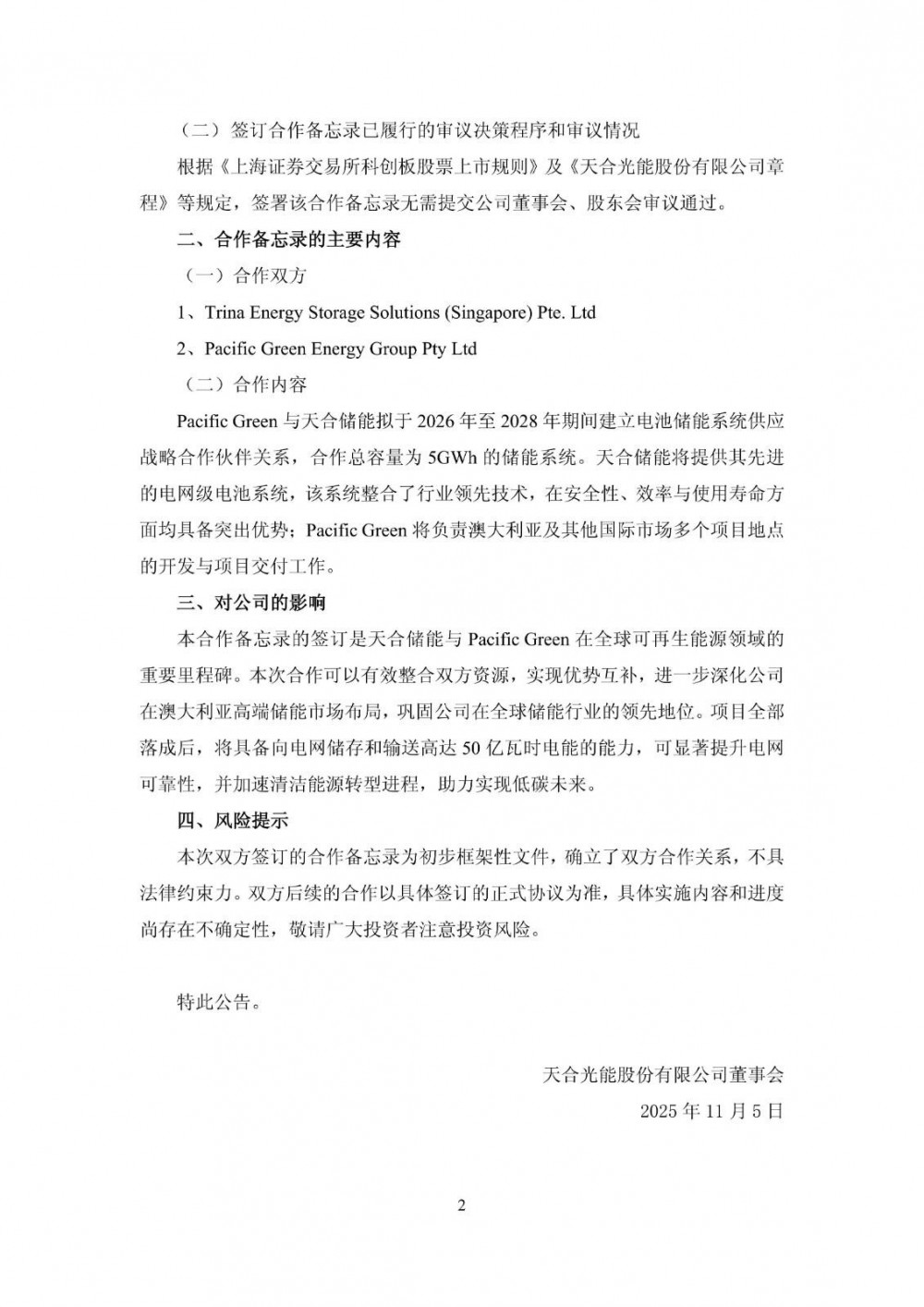 11月4日,天合光能发布公告称,公司的控股子公司Trina Energy Storage Solutions (Singapore) Pte. Ltd近日与Pacific Green Energy Group Pty Ltd(以下简称“Pacific Green”)签订了合作备忘录,双方拟就2026年至2028年期间供应5GWh的电网级电池储能系统展开合作。