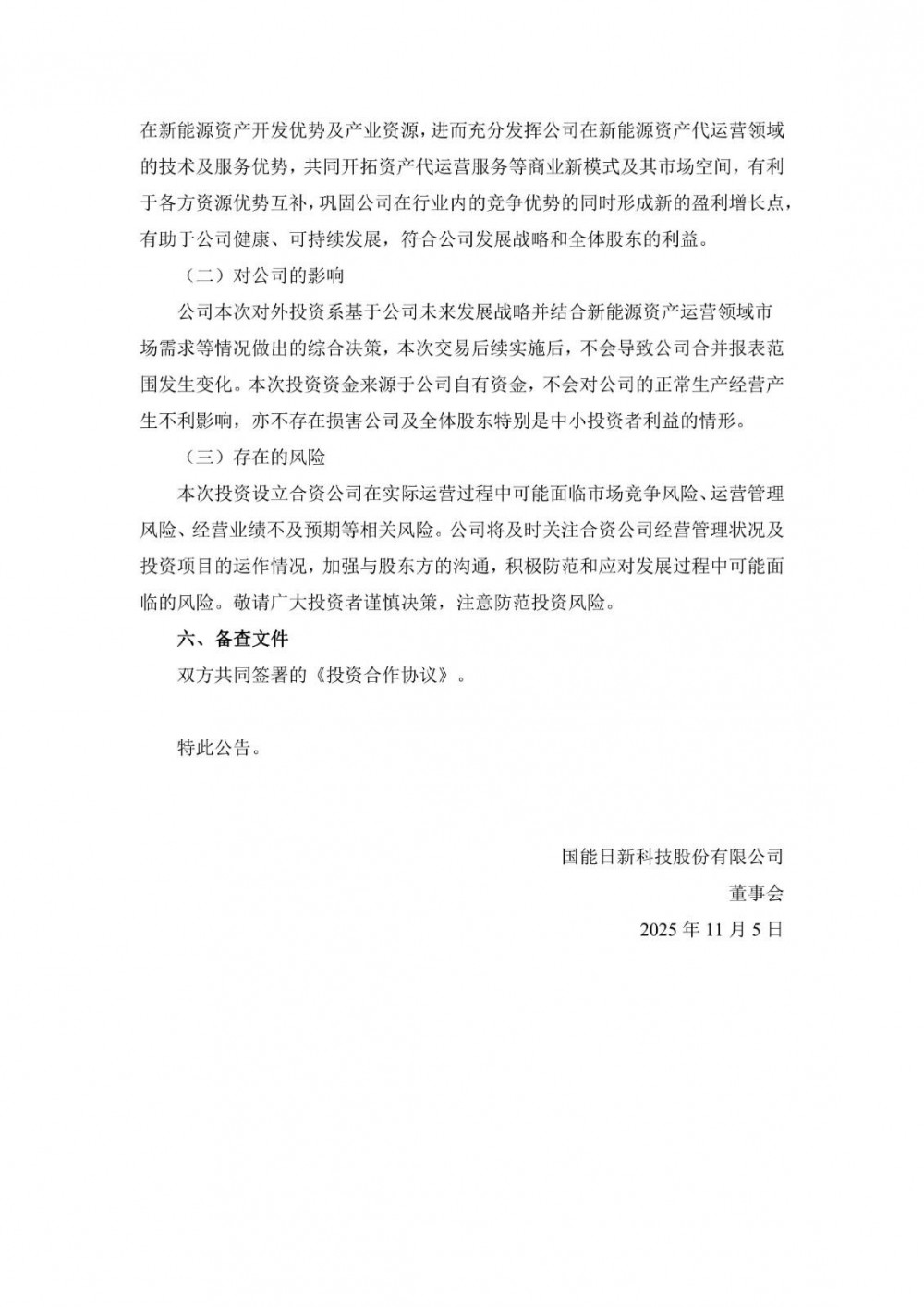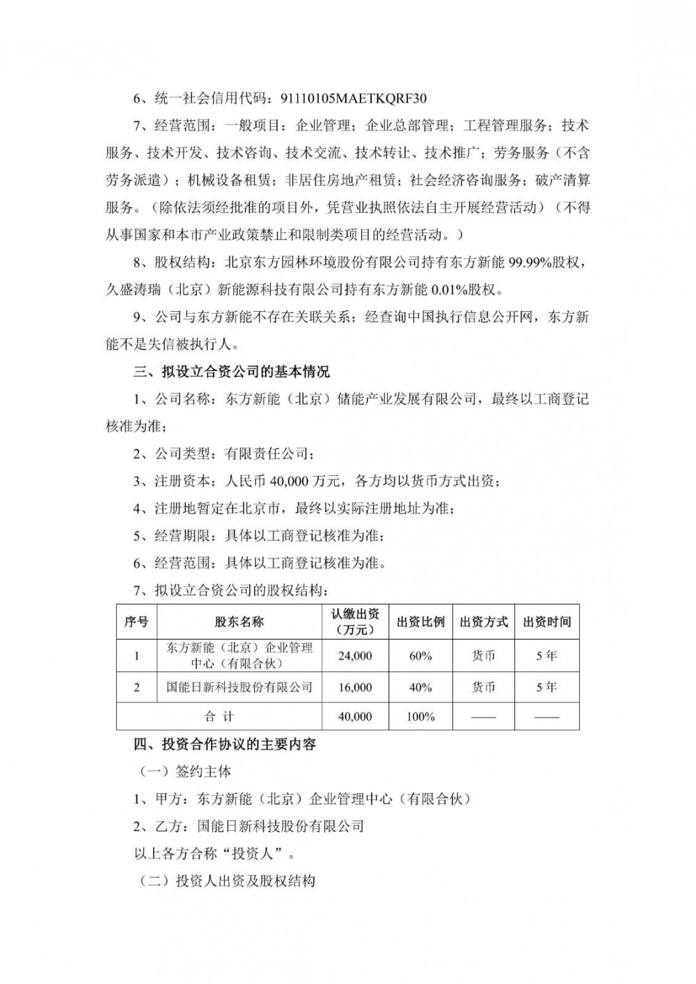 11月5日,国能日新发布公告称,公司基于公司发展战略规划及资产运营业务领域的布局,拟与东方新能(北京)企业管理中心(有限合伙)签订《投资合作协议》,双方拟共同出资设立东方新能(北京)储能产业发展有限公司(暂定名,最终以工商登记核准为准,以下简称“合资公司”),合资公司注册资本为人民币40,000万元。其中,东方新能认缴出资额为24,000万元,占合资公司注册资本的60%;公司以自有资金认缴出资额为16,000万元,占合资公司注册资本的40%。