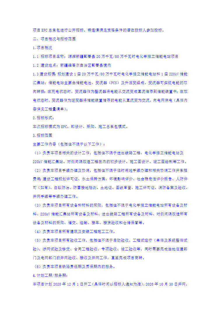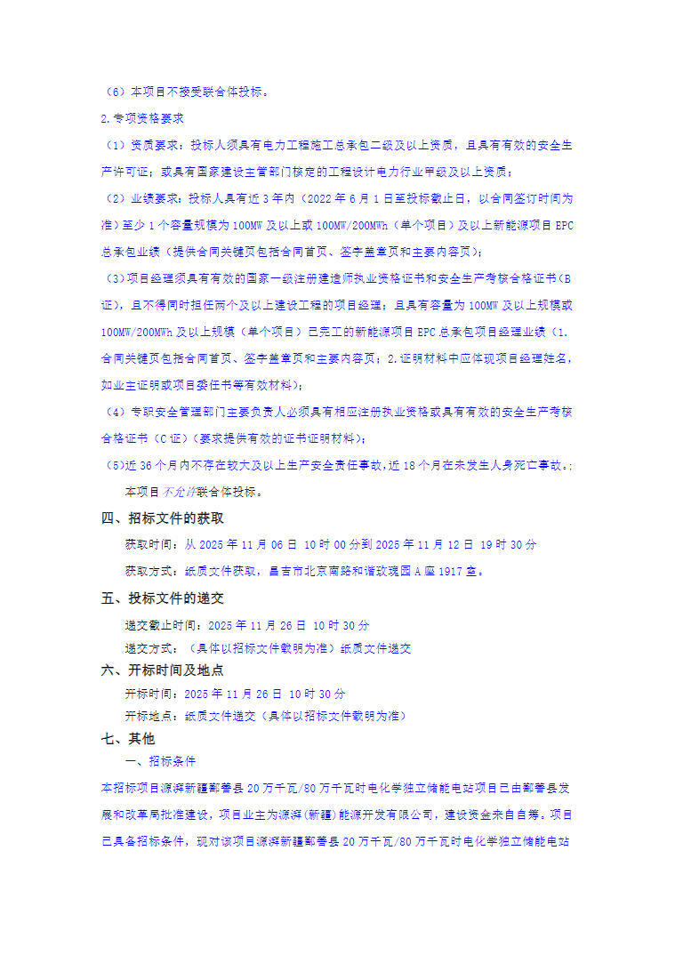 投标人资格要求近3年内需有至少1个容量规模为100MW及以上或100MWh/200MWh(单个项目)及以上的新能源项目EPC总承包业绩。同时,本项目不接受联合体投标。