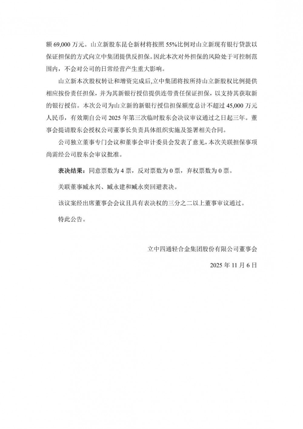 立中集团表示,本次交易符合公司控股子公司的战略发展需要,本次关联担保是因公司转让山立新股权及增资被动导致,本次交易完成后公司仍持有山立新45.1546%的股权。为保持山立新的正常运营,公司继续为其提供担保暨形成关联担保,担保金额69,000万元。山立新股东昆仑新材将按照55%比例对山立新现有银行贷款以保证担保的方式向立中集团提供反担保。因此本次对外担保的风险处于可控制范围内,不会对公司的日常经营产生重大影响。