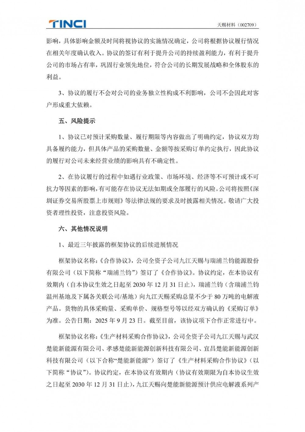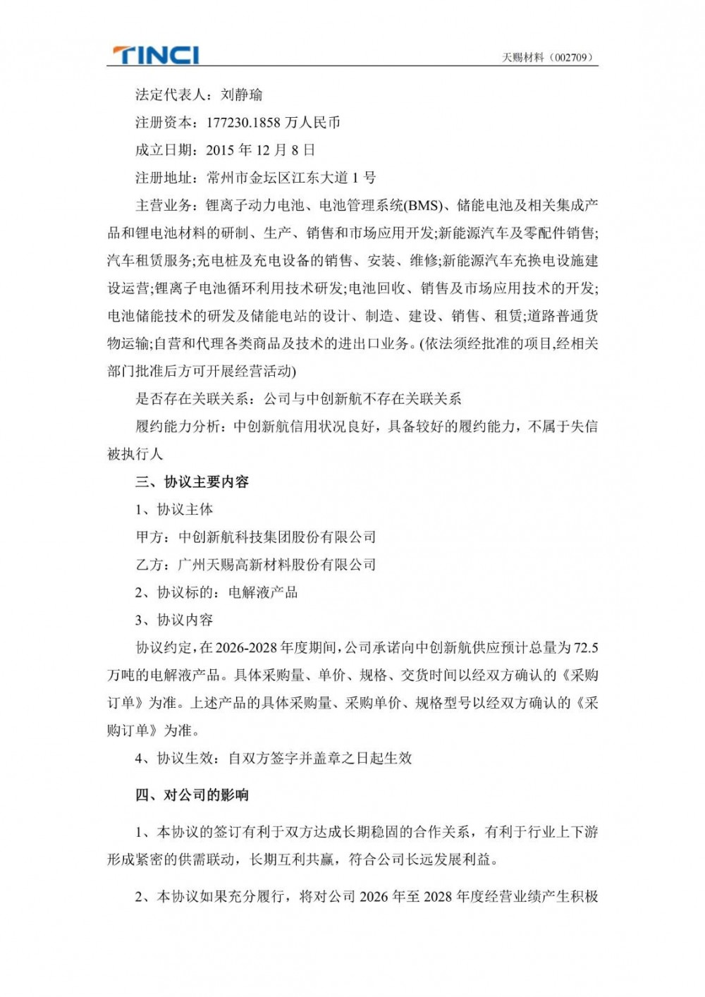 协议约定,在2026-2028年度期间,天赐材料承诺向中创新航供应预计总量为72.5万吨的电解液产品。具体采购量、单价、规格、交货时间以经双方确认的《采购订单》为准。上述产品的具体采购量、采购单价、规格型号以经双方确认的《采购订单》为准。