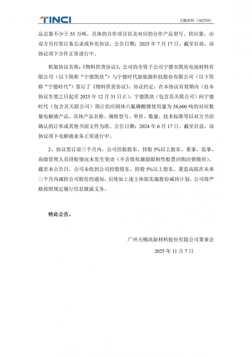 11月6日,天赐材料发布公告称,公司与中创新航科技集团股份有限公司签订了《2026-2028年保供框架协议》。