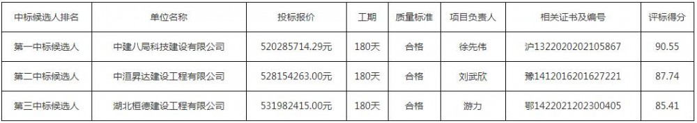 第一中标候选人为中建八局科技建设有限公司,投标报价520285714.29元,折合单价1.3007元/Wh;第二中标候选人为中洹昇达建设工程有限公司,投标报价528154263元,折合单价1.3204元/Wh;第三中标候选人为湖北桓德建设工程有限公司,投标报价531982415元,折合单价1.33元/Wh。
