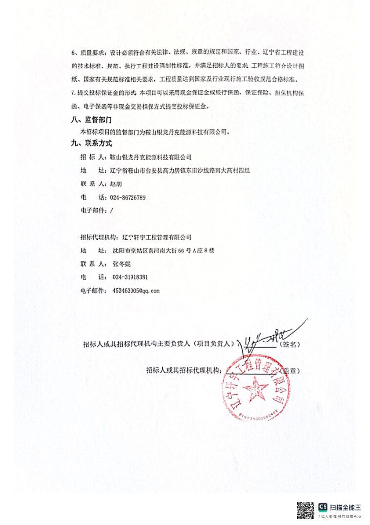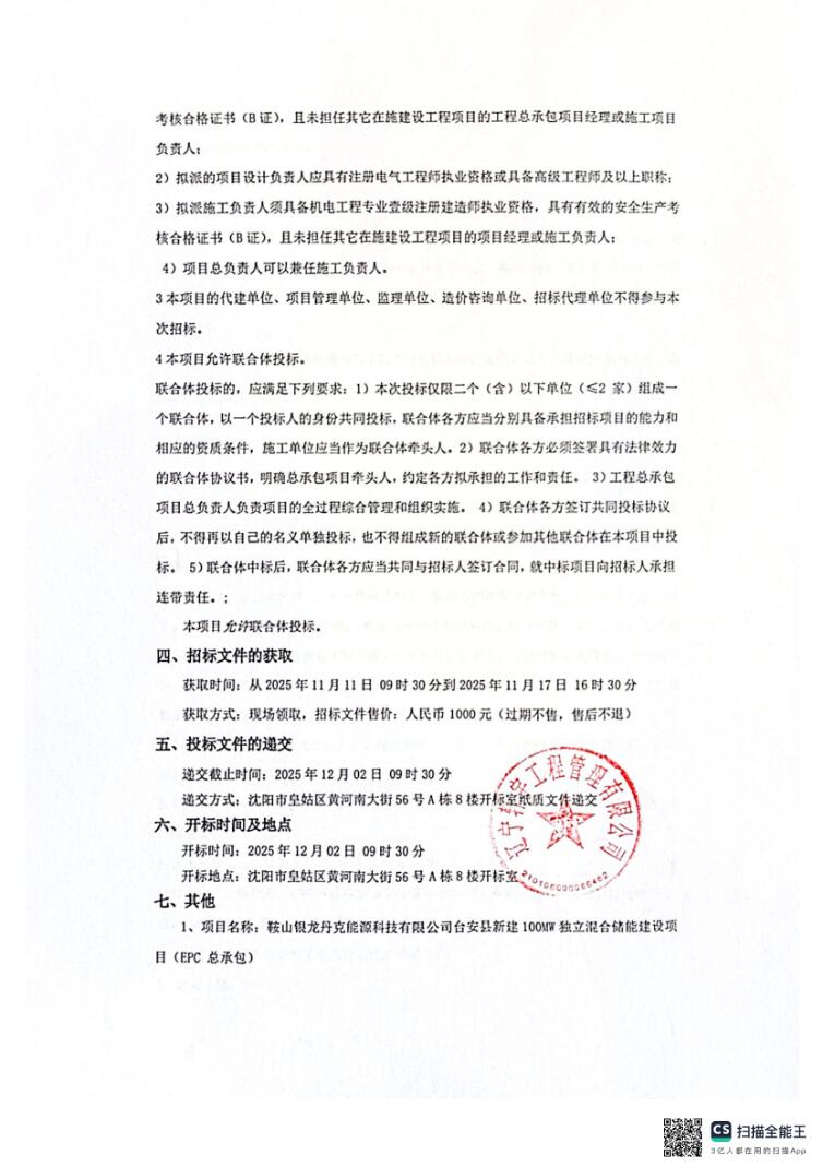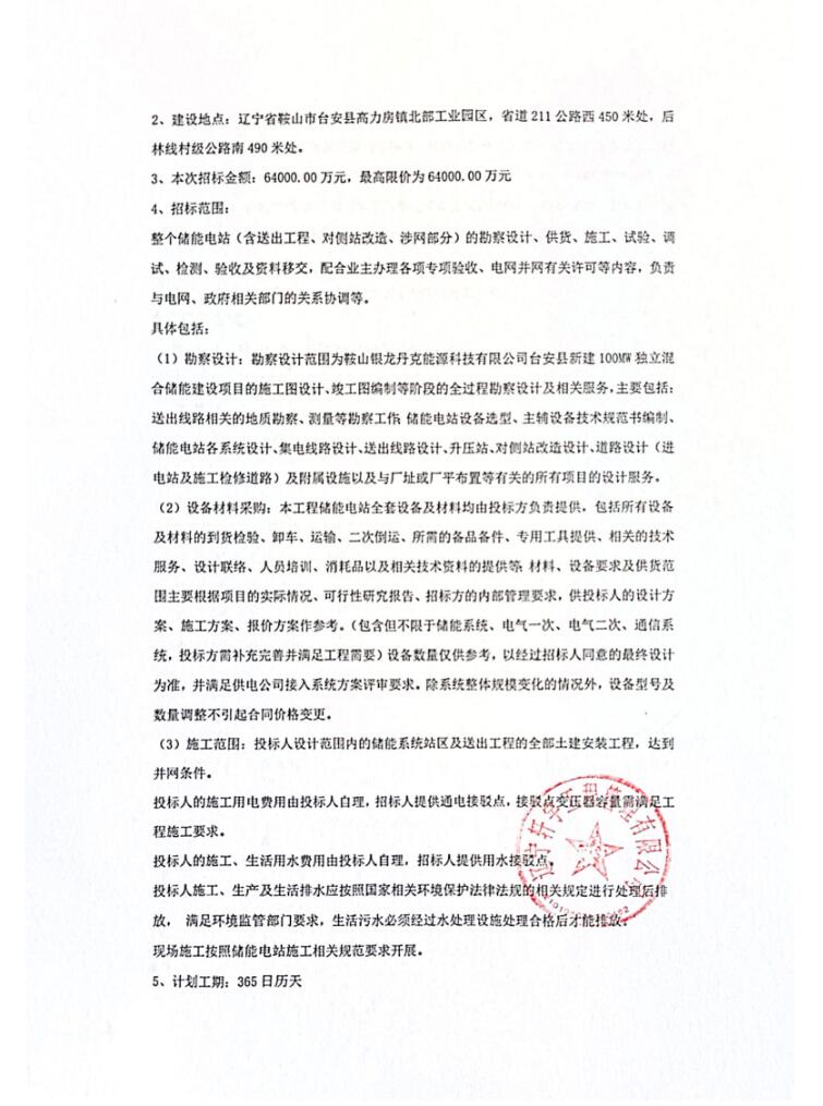 11月11日,鞍山银龙丹克能源科技有限公司台安县新建100MW独立混合储能建设项目(EPC 总承包)招标公告发布。