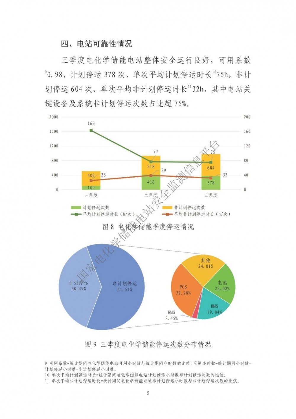 从电站可靠性情况来看,三季度电化学储能电站整体安全运行良好,可用系数0.98,计划停运378次,单次平均计划停运时长75h,非计划停运604次,单次平均非计划停运时长32h。其中电站关键设备及系统非计划停运次数占比超75%。其中,PCS占32.28%、电池22.02%、BMS19.04%、EMS2.65%、其他24.01%。