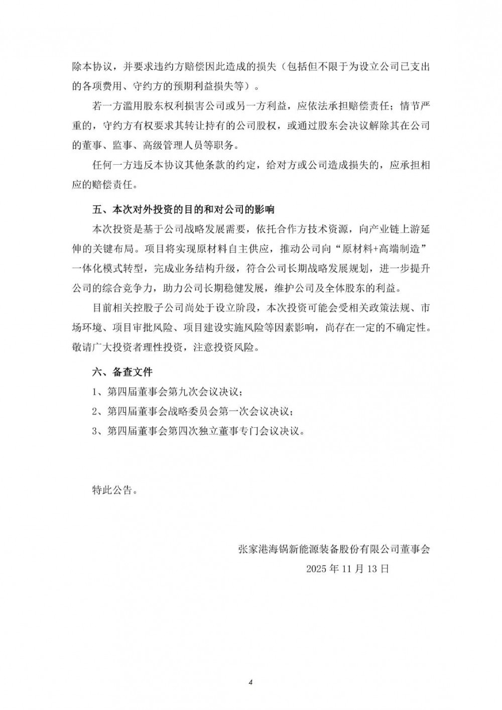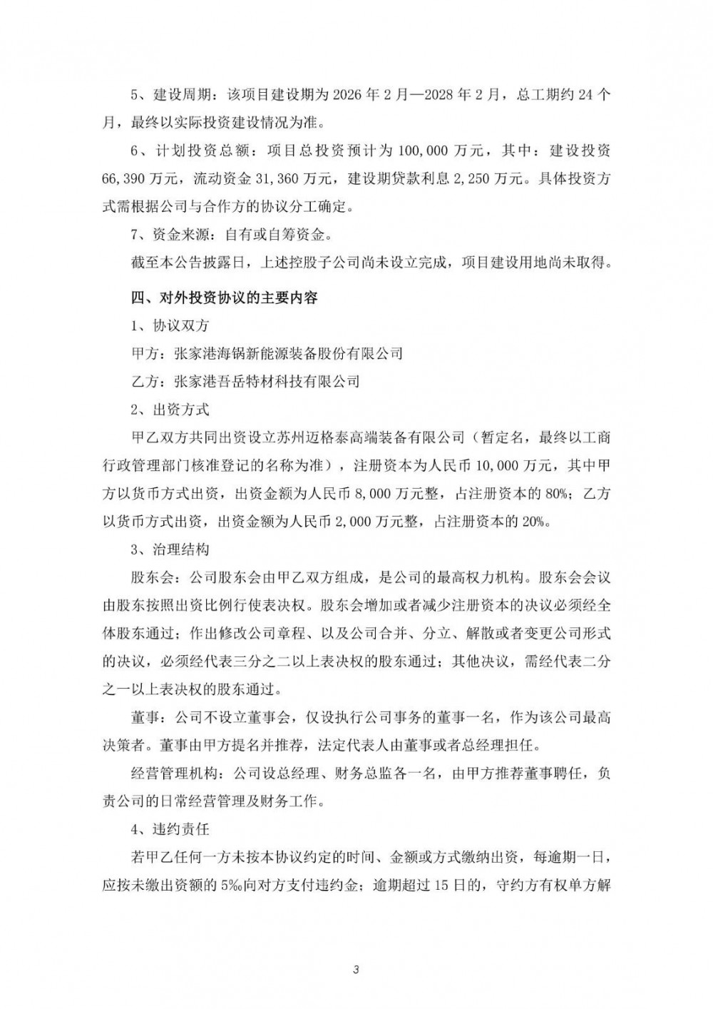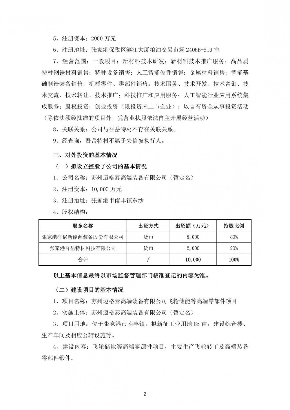 11月12日,海锅股份发布公告称,公司召开第四届董事会第九次会议,审议通过了《关于投资建设飞轮储能等高端零部件项目暨设立控股子公司的议案》。同意公司与张家港吾岳特材科技有限公司签署《项目战略合作协议》,由公司与吾岳特材共同出资设立控股子公司苏州迈格泰高端装备有限公司,注册资本为10,000万元,其中公司以货币形式出资8,000万元,占注册资本的80%,吾岳特材以货币形式出资2,000万元,占注册资本的20%;以苏州迈格泰作为实施主体,在张家港市南丰镇东沙建设飞轮储能等高端零部件项目,项目投资总额预计为100,000万元,主要生产飞轮转子及高端装备零部件锻件;并同意提请股东会授权公司董事长或其授权人士全权处理项目公司设立等相关事宜。