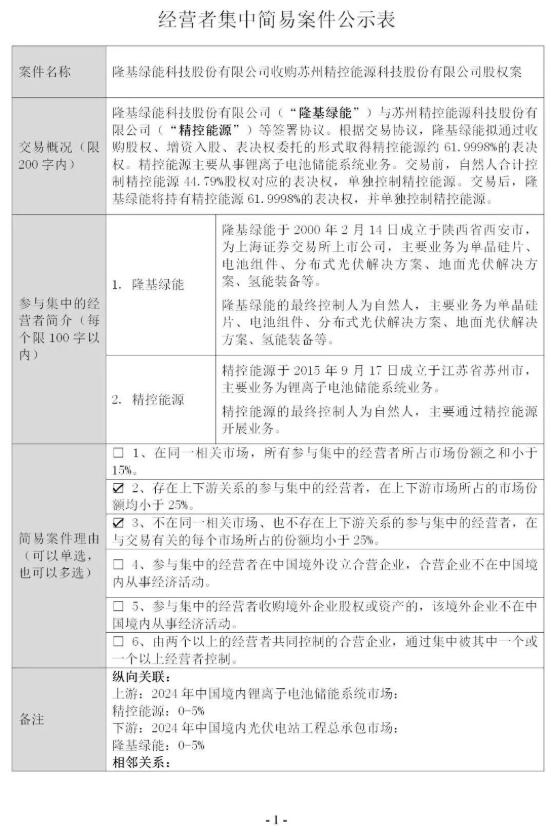 其中,经营者集中简易案件公示表显示隆基绿能科技股份有限公司(“隆基绿能”)与苏州精控能源科技股份有限公司(“精控能源”)等签署协议。根据交易协议,隆基绿能拟通过收购股权、增资入股、表决权委托的形式取得精控能源约61.9998%的表决权。精控能源主要从事锂离子电池储能系统业务。交易前,自然人合计控制精控能源44.79%股权对应的表决权,单独控制精控能源。交易后,隆基绿能将持有精控能源61.9998%的表决权,并单独控制精控能源。