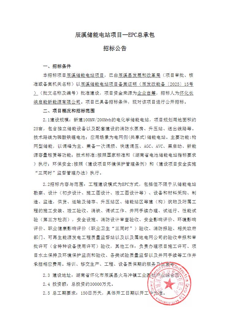 近日,辰溪储能电站项目—EPC总承包招标公告发布。