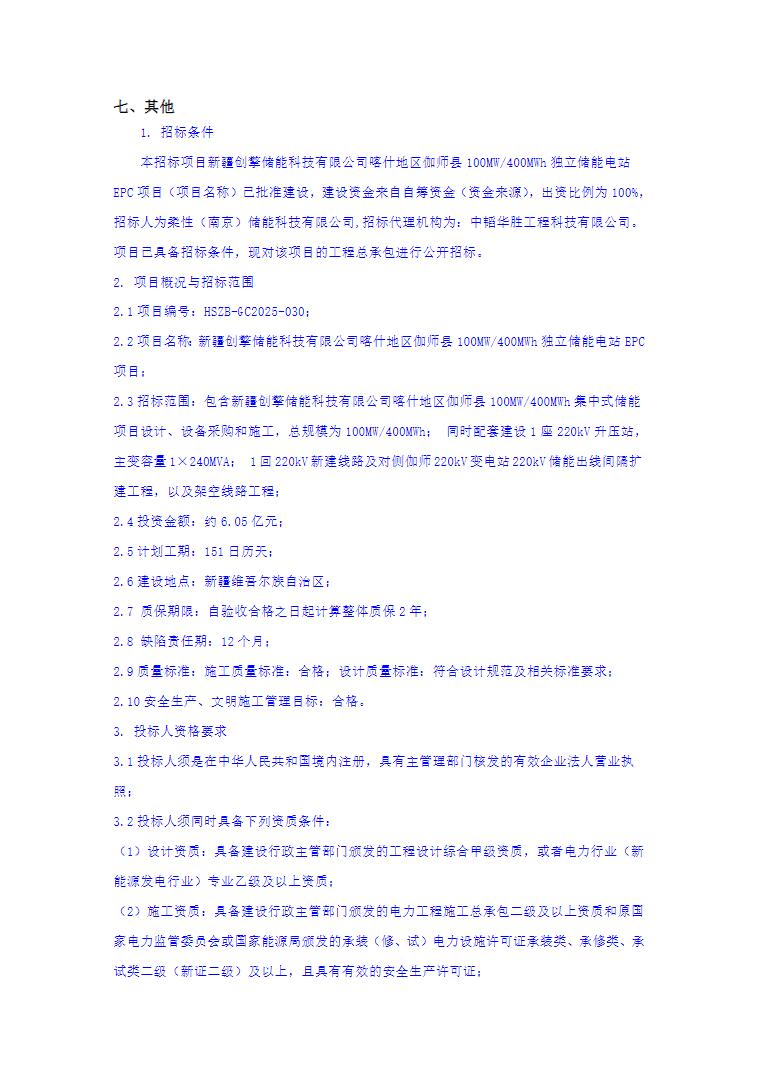 11月14日,新疆创擎储能科技有限公司喀什地区伽师县100MW/400MWh独立储能电站EPC项目招标公告发布。