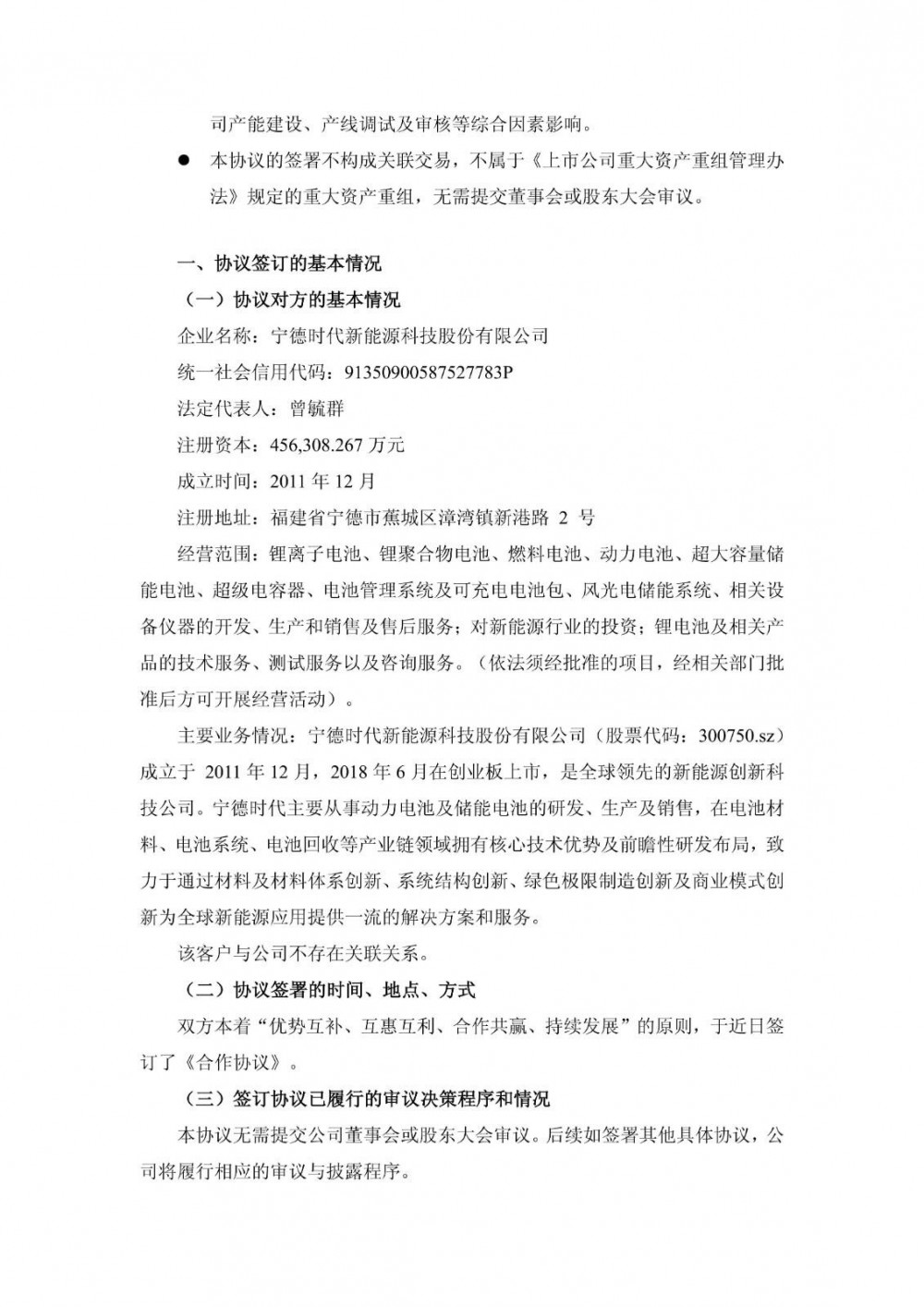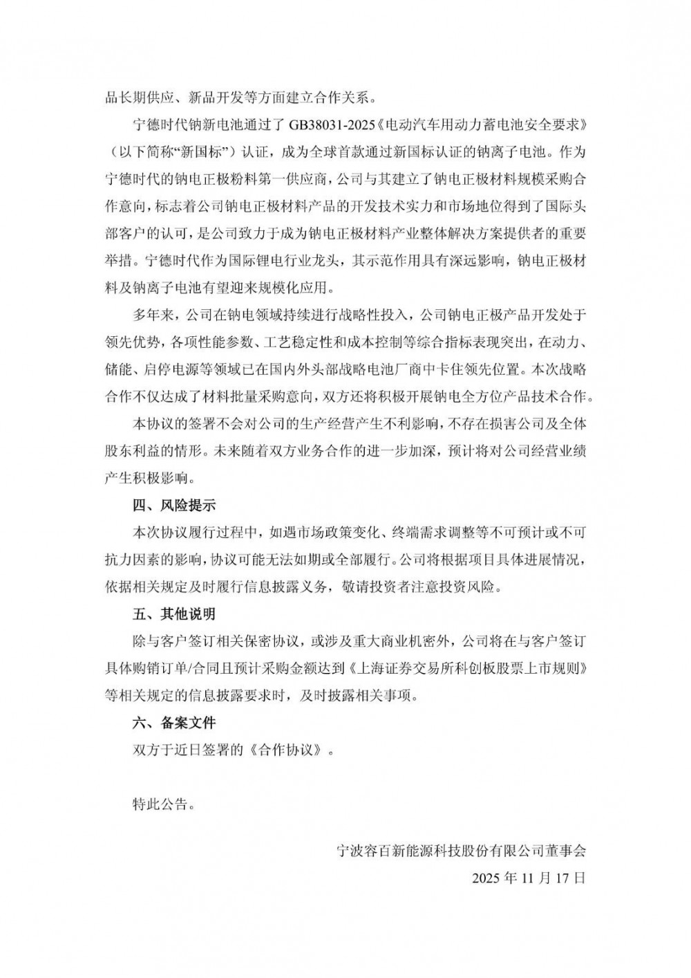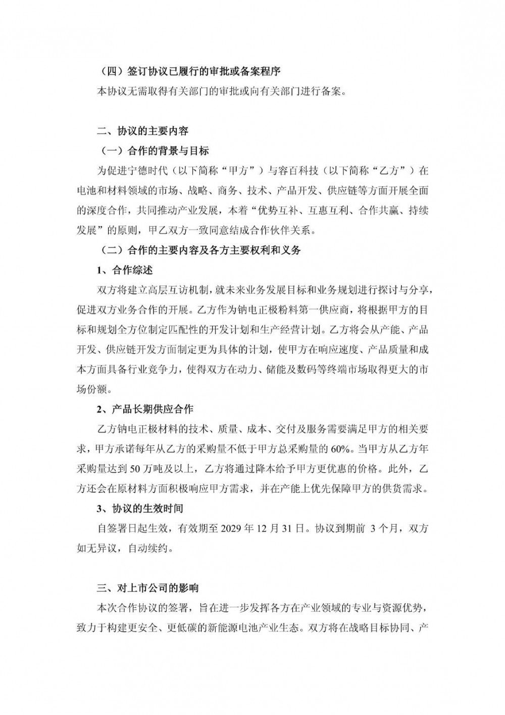 根据本协议约定,宁德时代将容百科技作为其钠电正极粉料第一供应商。本协议的签订标志着国际头部客户对公司相关产品开发技术实力和市场地位的认可,亦表明公司钠电正极材料产品在动力、储能、数码等领域将得到全方位推广应用。