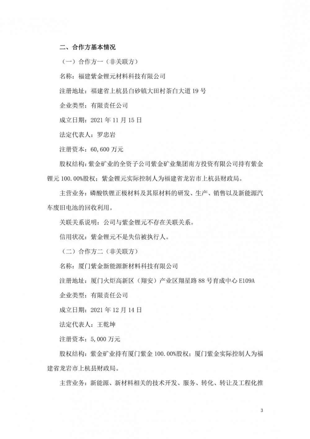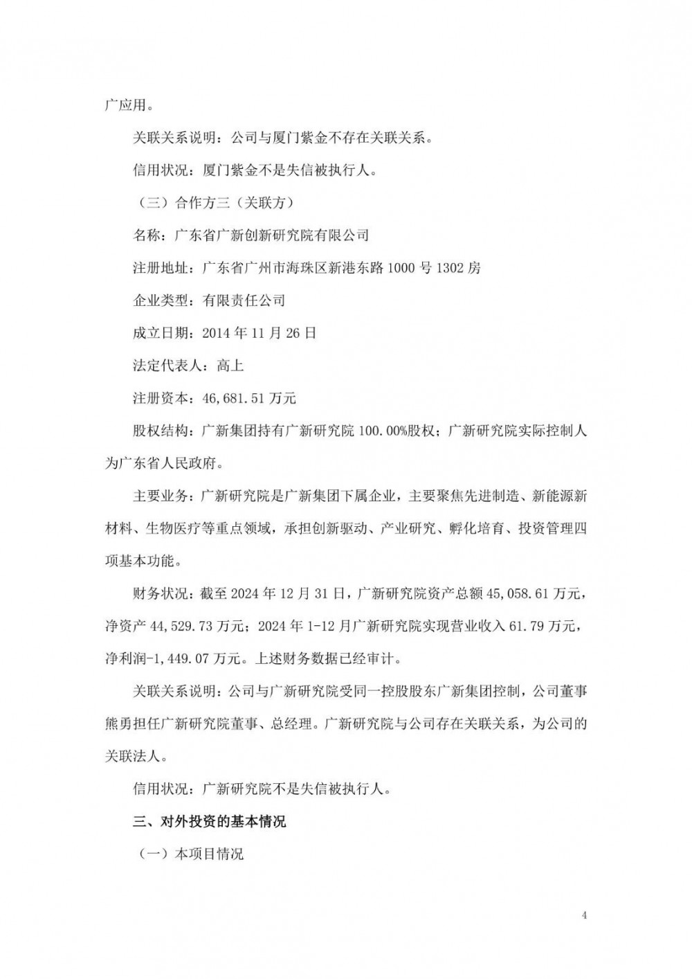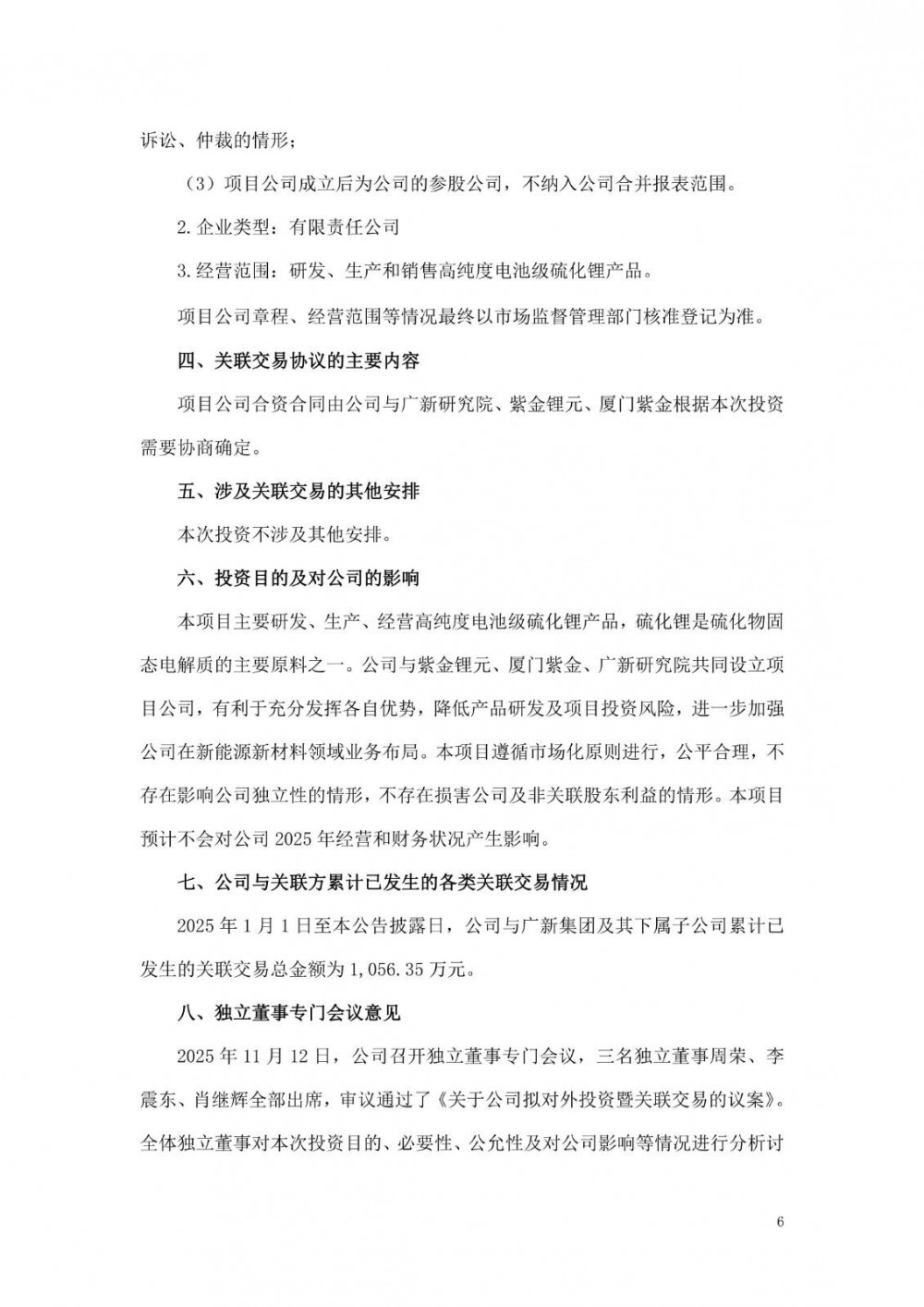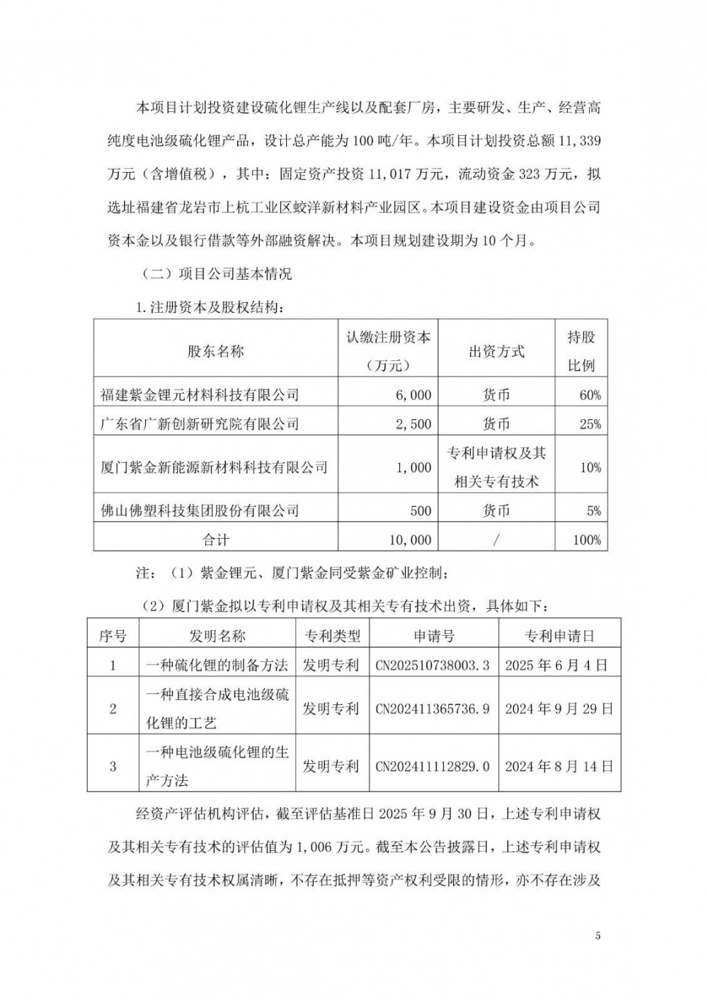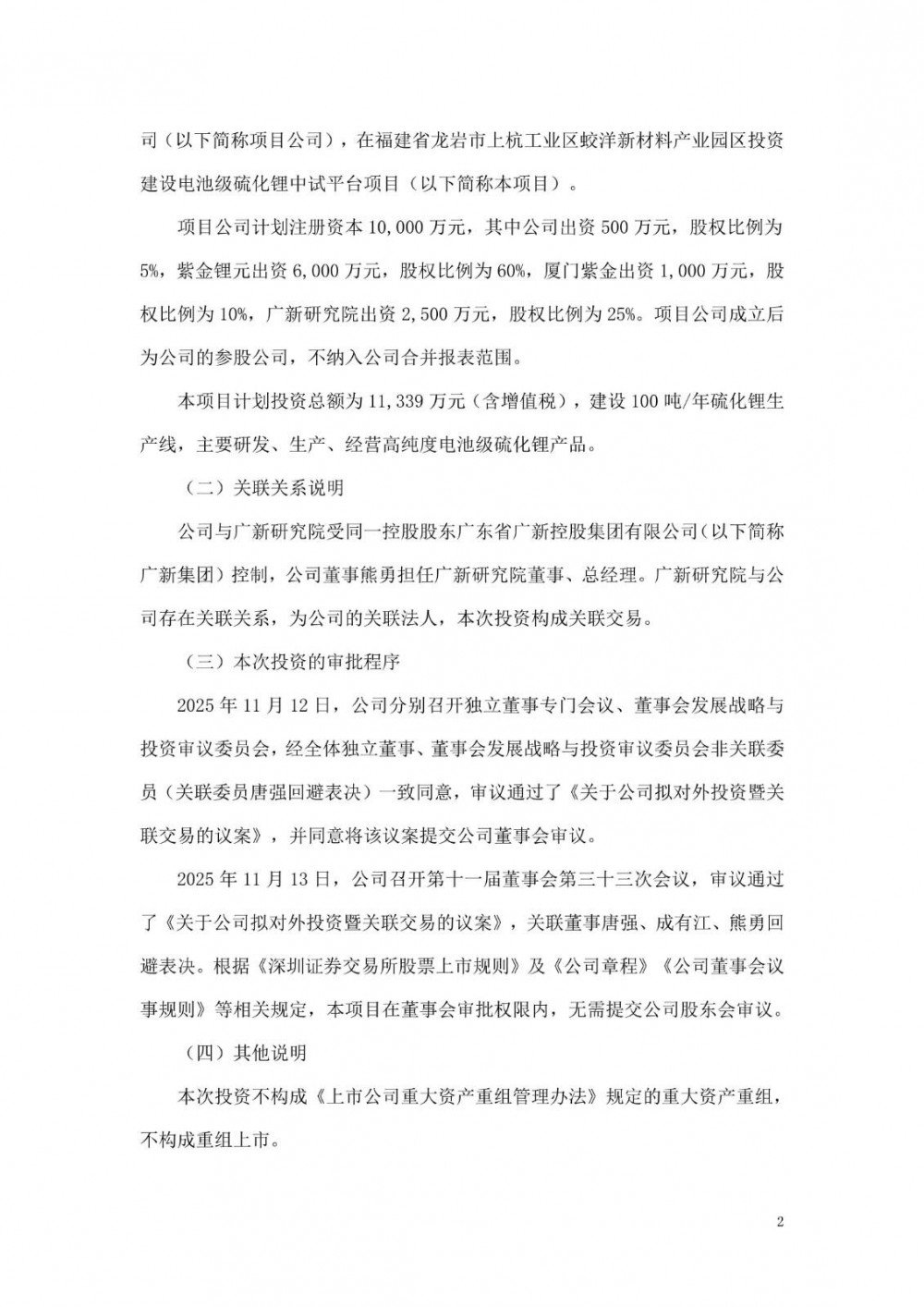 项目公司计划注册资本10,000万元,其中公司出资500万元,股权比例为5%,紫金锂元出资6,000万元,股权比例为60%,厦门紫金出资1,000万元,股权比例为10%,广新研究院出资2,500万元,股权比例为25%。项目公司成立后为公司的参股公司,不纳入公司合并报表范围。