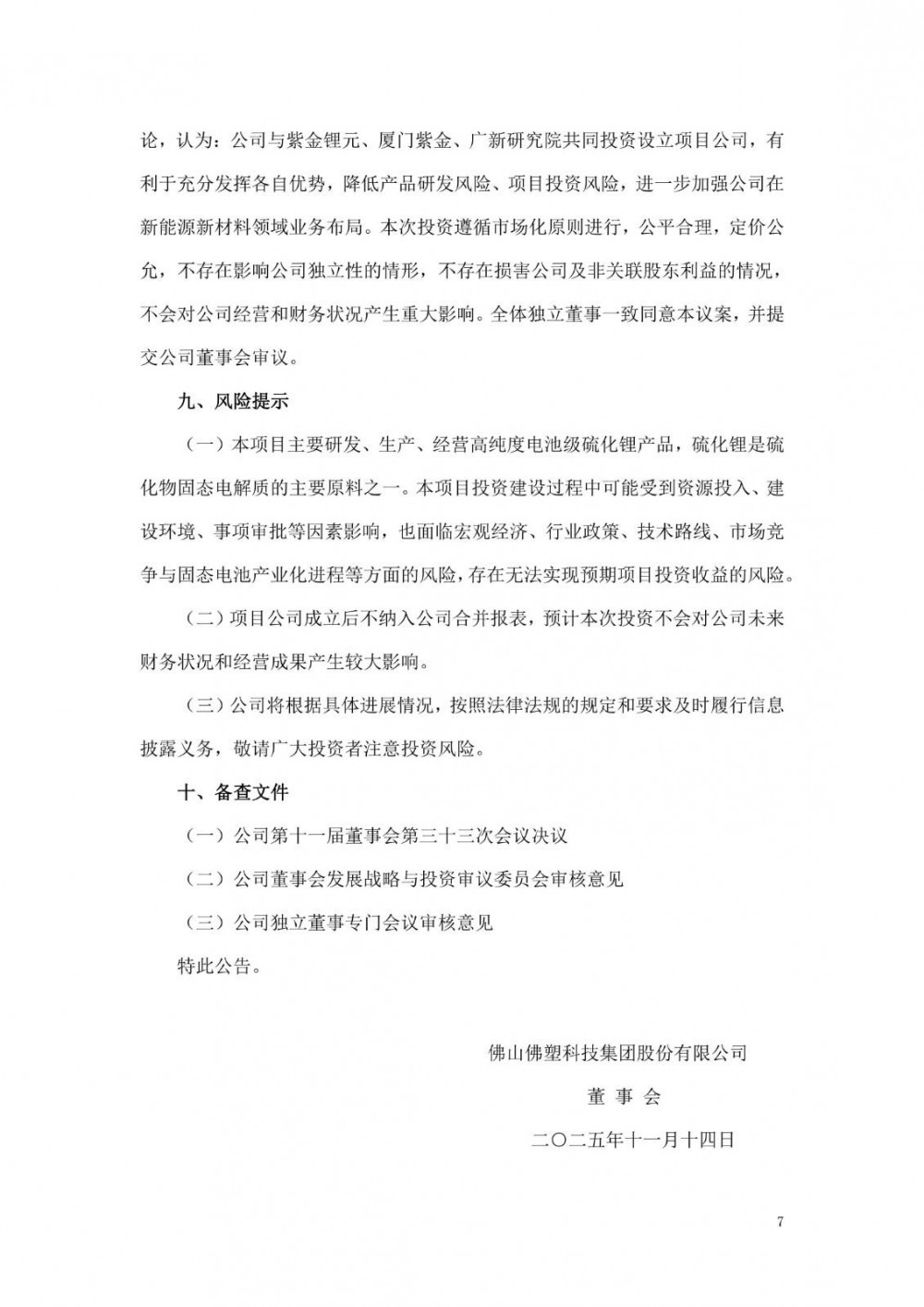 近日,佛塑科技发布公告称,公司拟与紫金矿业集团股份有限公司下属子公司福建紫金锂元材料科技有限公司、厦门紫金新能源新材料科技有限公司以及广东省广新创新研究院有限公司共同出资设立项目公司,在福建省龙岩市上杭工业区蛟洋新材料产业园区投资建设电池级硫化锂中试平台项目。