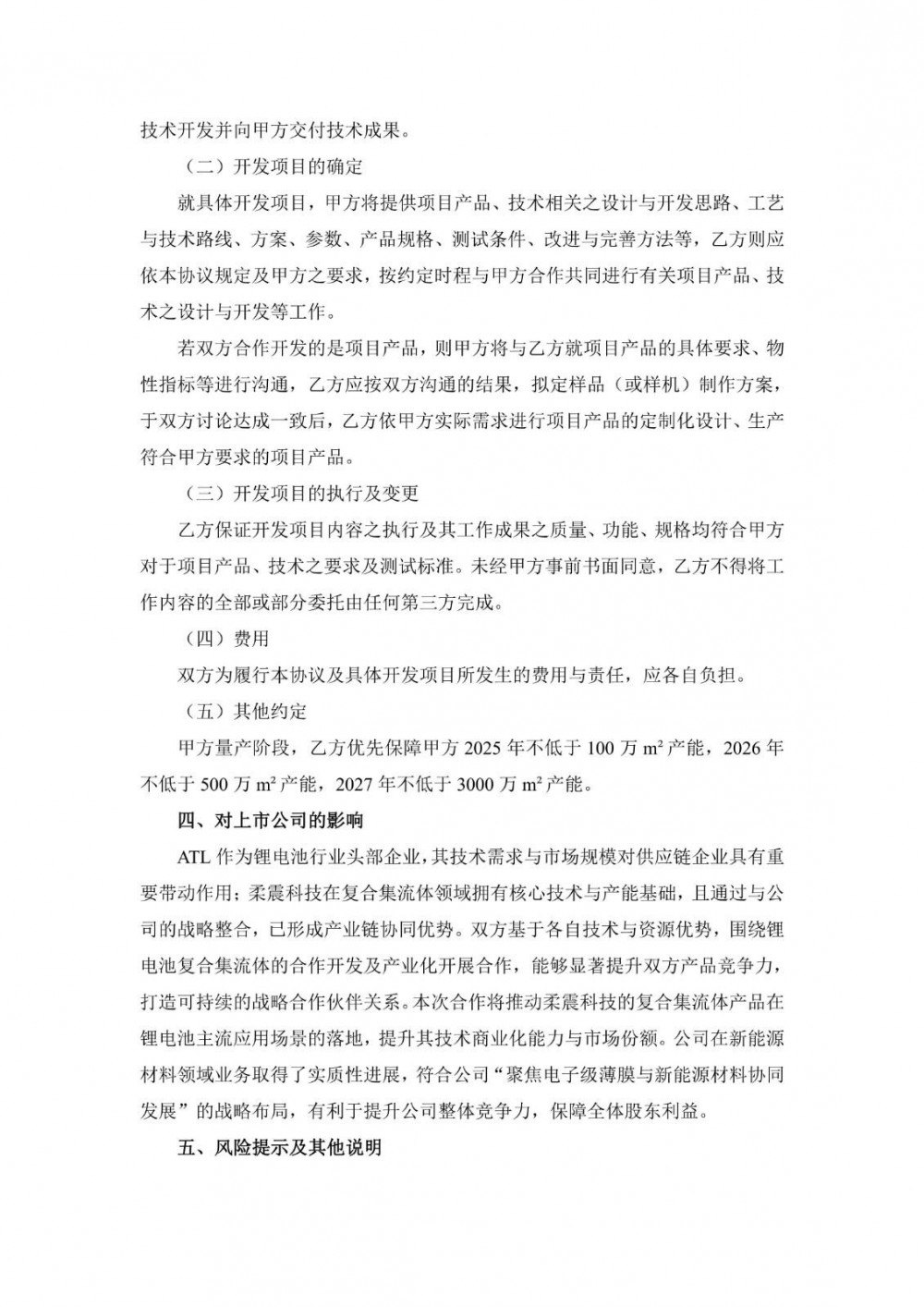 双方就“锂电池复合集流体”的联合设计开发、技术成果交付及后续产能保障等事宜达成合作,柔震科技将依据ATL需求完成定制化开发、样品交付及量产供应,双方共同推进复合集流体在锂电池领域的产业化应用。