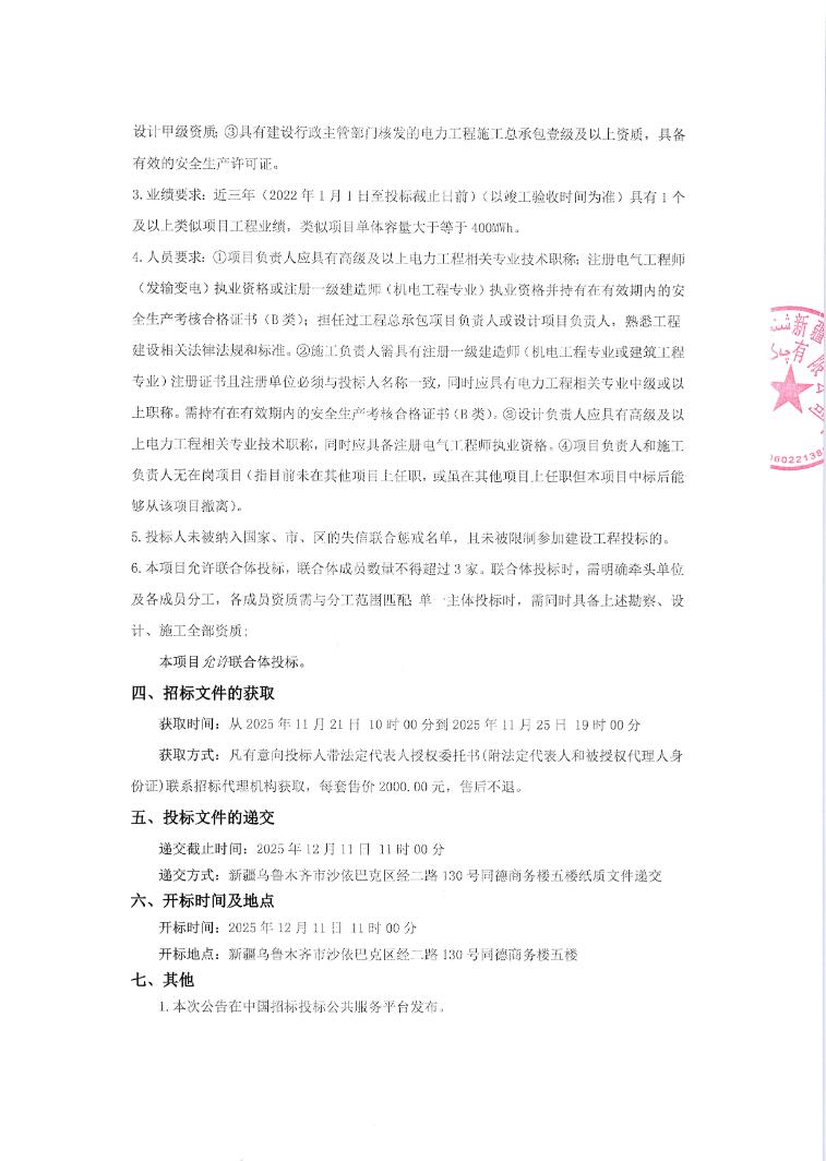 投标人近三年(2022年1月1日至投标截止日)需有1个及以上单体容量≥400MWh的类似项目业绩,本项目允许不超过3家单位组成的联合体投标。
