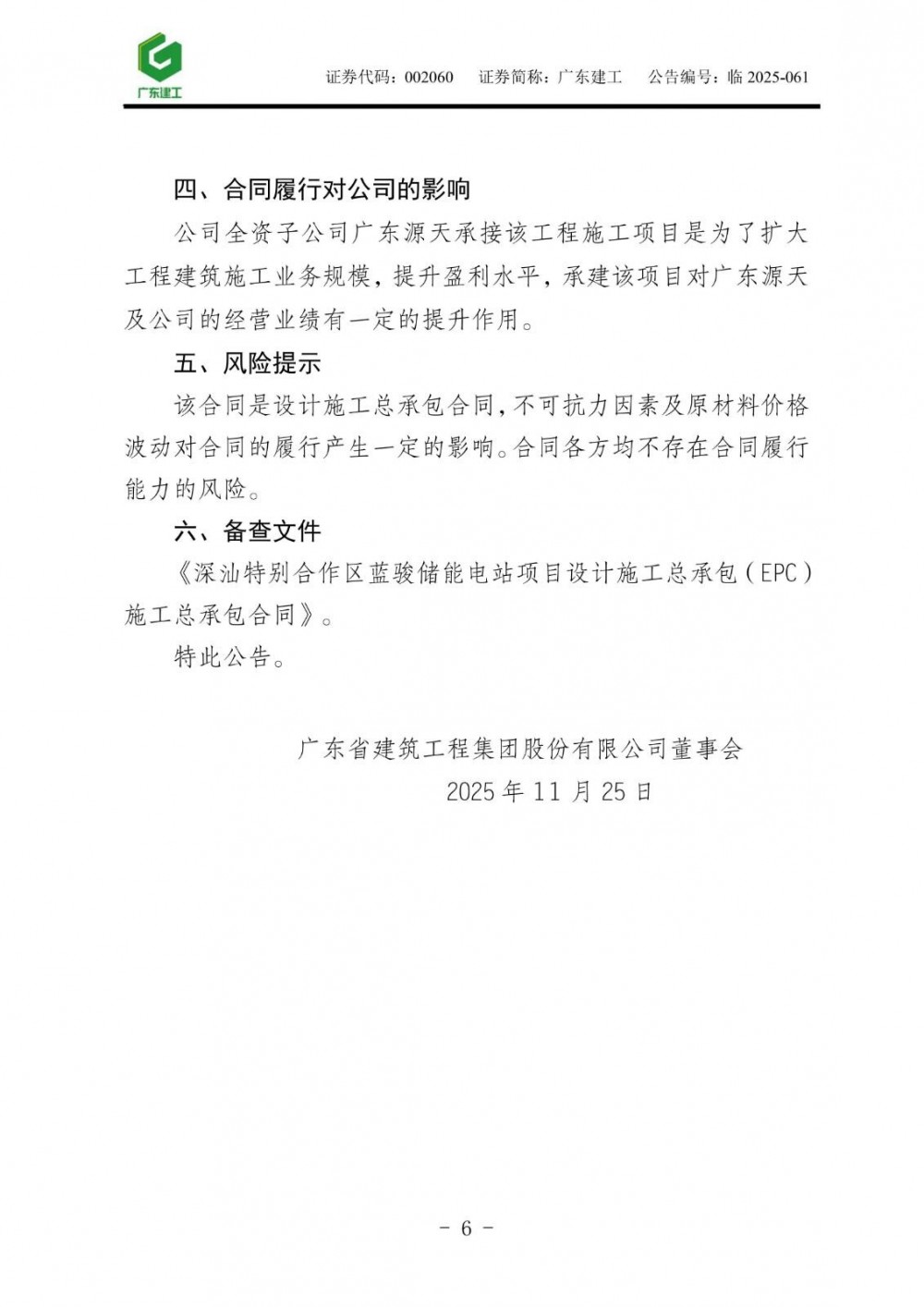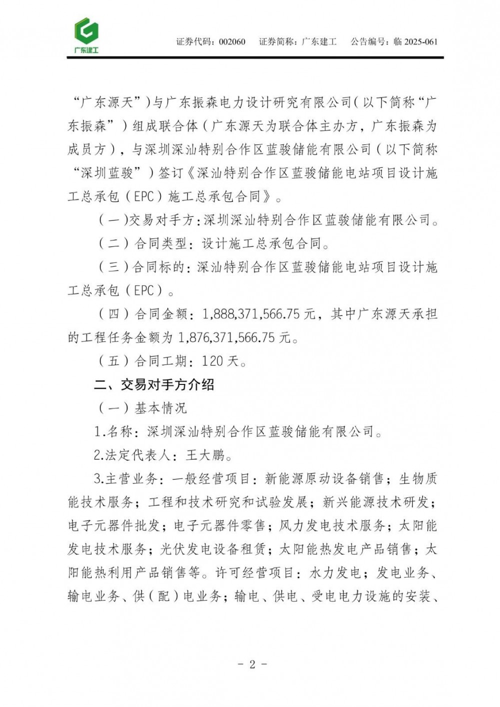 11月24日,广东建工发布公告称,公司全资子公司广东省源天工程有限公司与广东振森电力设计研究有限公司组成联合体,与深圳深汕特别合作区蓝骏储能有限公司(以下简称“深圳蓝骏”)签订《深汕特别合作区蓝骏储能电站项目设计施工总承包(EPC)施工总承包合同》。