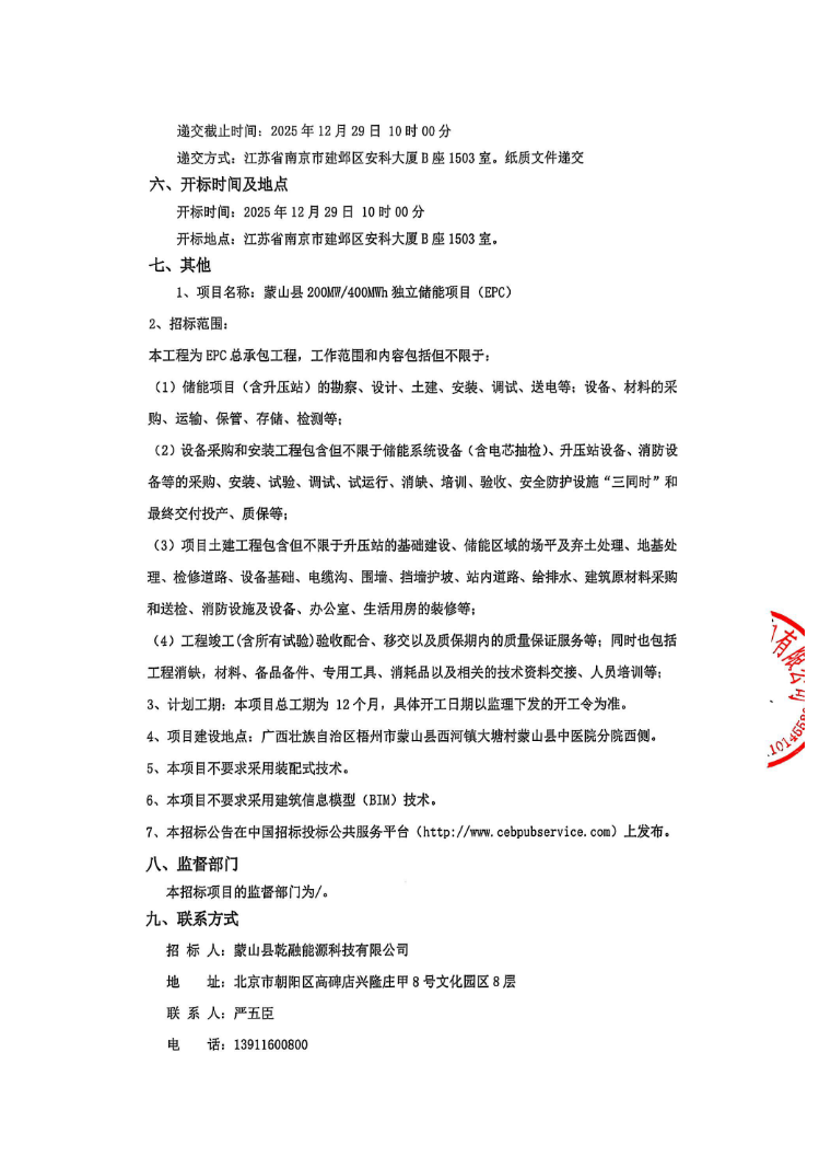 储能界获悉,11月27日,蒙山县200MW/400MWh独立储能项目(EPC)招标公告发布,招标人为蒙山县乾融能源科技有限公司。