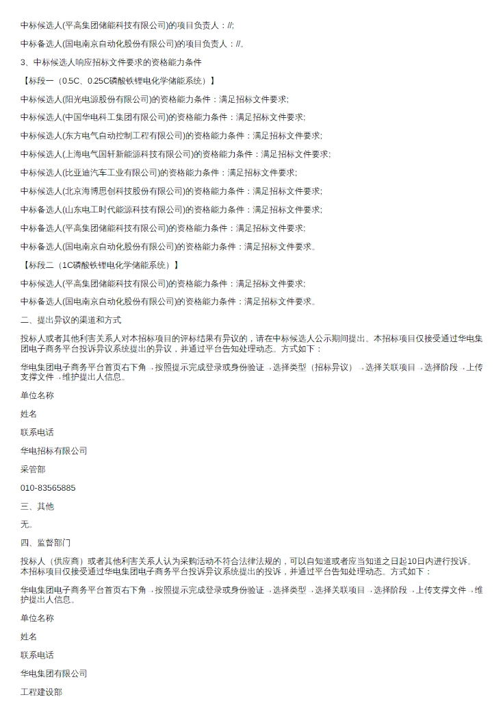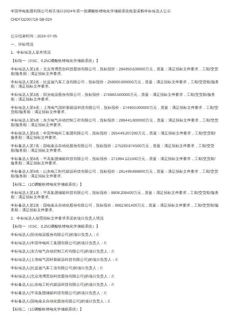 据储能界了解到,7月2日,中国华电集团有限公司2024年第一批磷酸铁锂电化学储能系统框架采购中标候选人公示。分为两个标段,共5.1GWh。