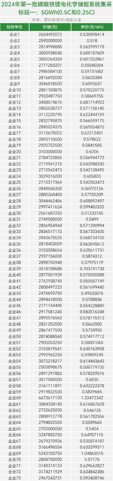 共有9家企业入围,其中中标候选人共6家,中标备选人3家,报价范围0.495-1.049元/Wh,平均报价0.588元/Wh。
