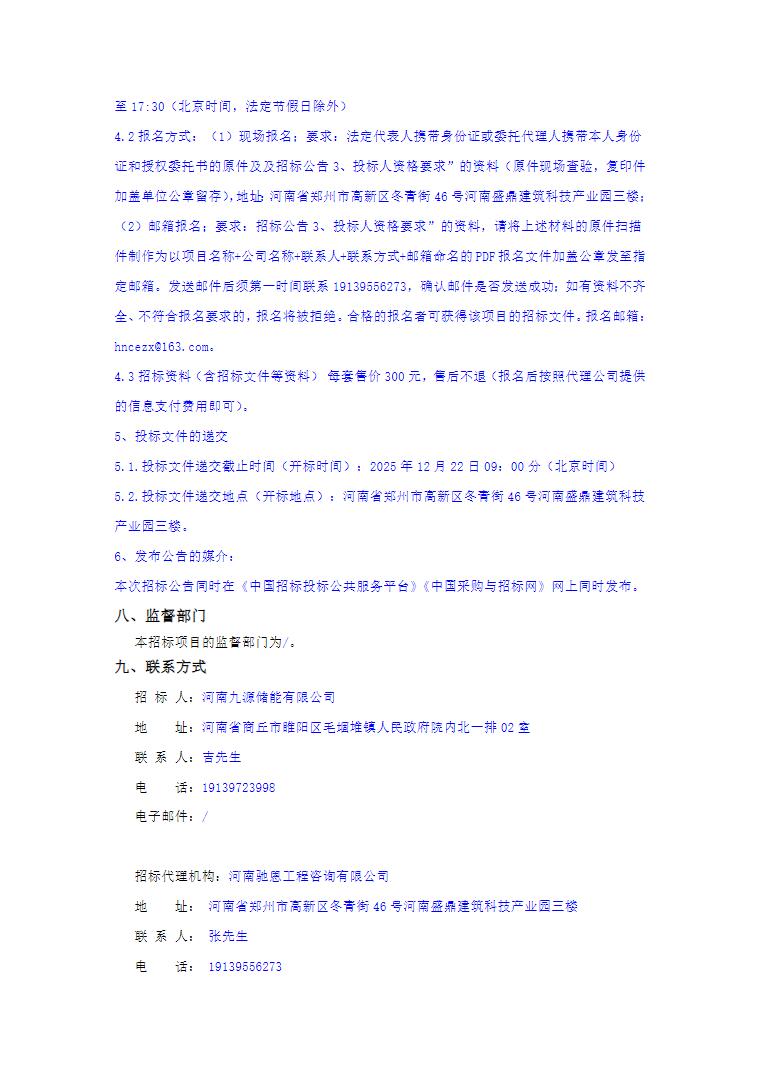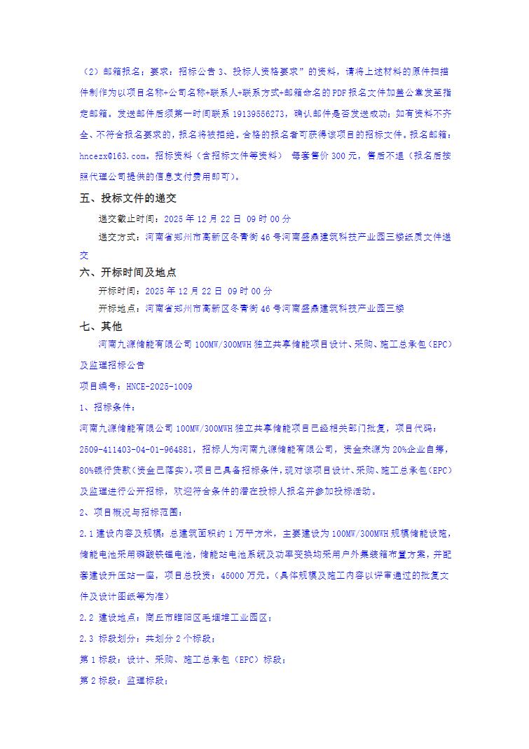 11月30日,河南九源储能有限公司100MW/300MWH独立共享储能项目设计、采购、施工总承包(EPC)及监理招标公告发布。