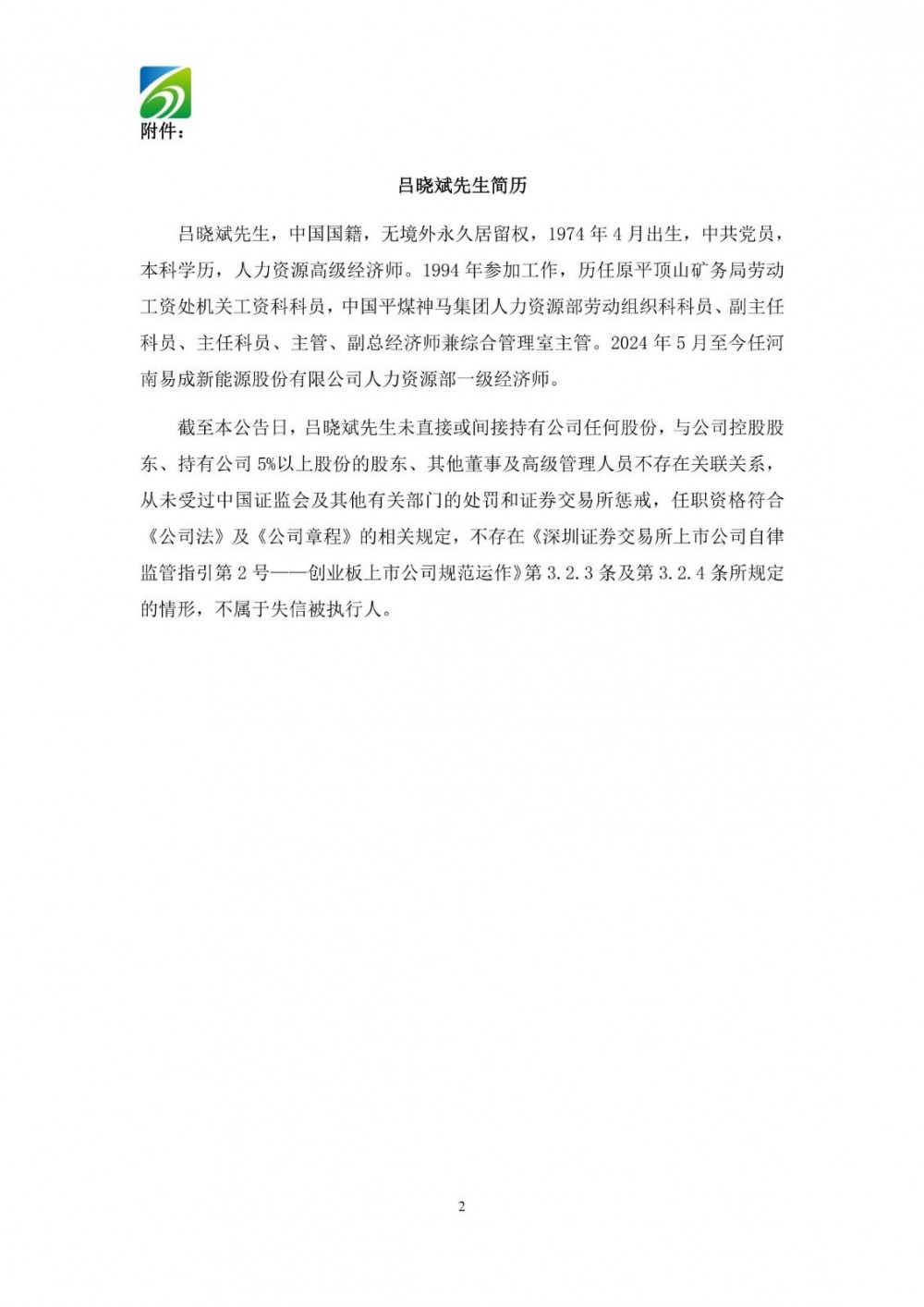 吕晓斌先生,中国国籍,无境外永久居留权,1974年4月出生,中共党员,本科学历,人力资源高级经济师。1994年参加工作,历任原平顶山矿务局劳动工资处机关工资科科员,中国平煤神马集团人力资源部劳动组织科科员、副主任科员、主任科员、主管、副总经济师兼综合管理室主管。2024年5月至今任河南易成新能源股份有限公司人力资源部一级经济师。