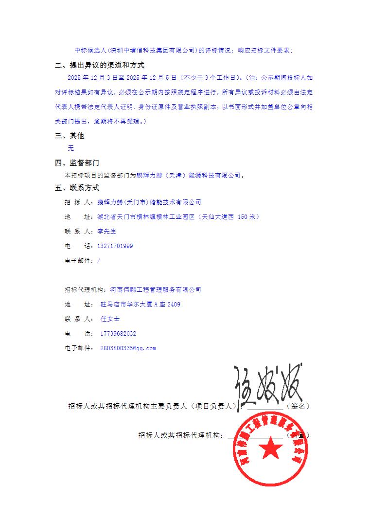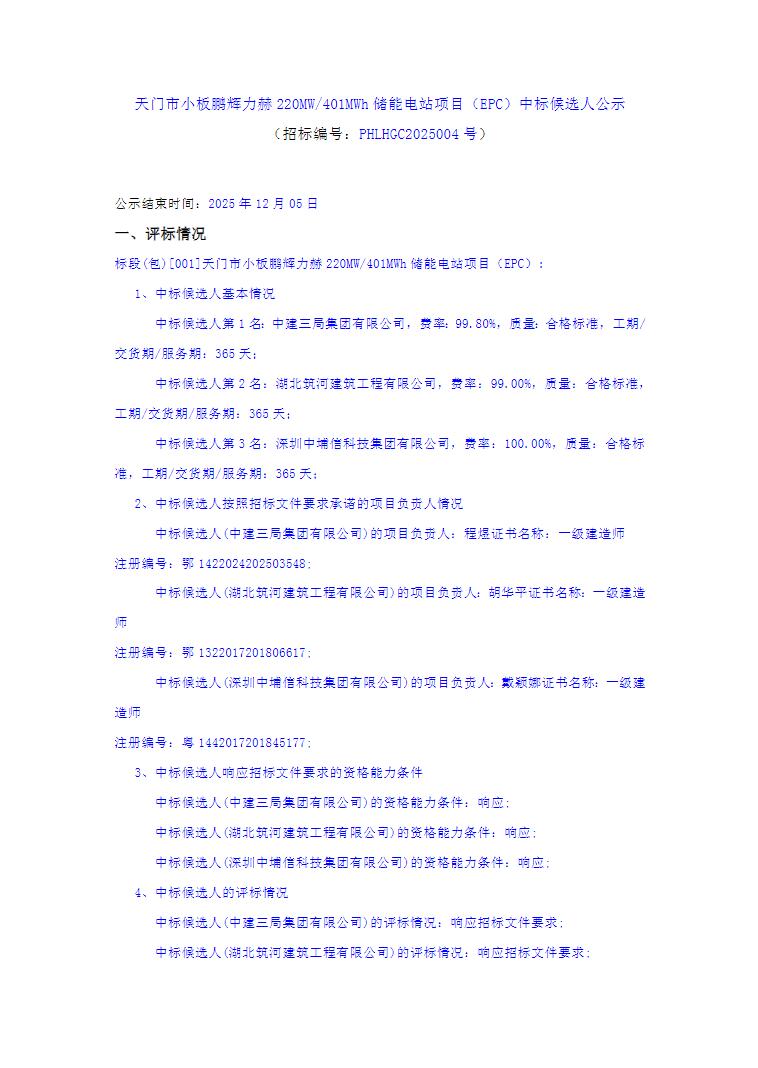 12月2日,天门市小板鹏辉力赫220MW/401MWh储能电站项目(EPC)中标候选人公示。