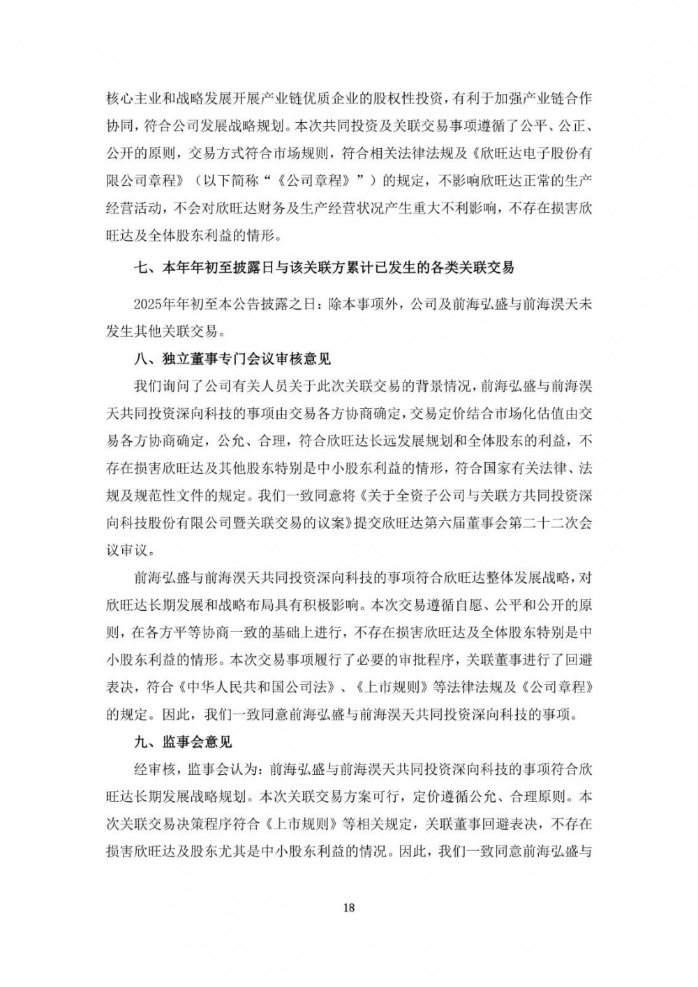 欣旺达表示,本次前海淏天认购深向科技股权的交易,是公司为契合长期业务需求,围绕核心主业和战略发展开展产业链优质企业的股权性投资,有利于加强产业链合作协同,符合公司发展战略规划。本次共同投资及关联交易事项遵循了公平、公正、公开的原则,交易方式符合市场规则,符合相关法律法规及《欣旺达电子股份有限公司章程》的规定,不影响欣旺达正常的生产经营活动,不会对欣旺达财务及生产经营状况产生重大不利影响,不存在损害欣旺达及全体股东利益的情形。
