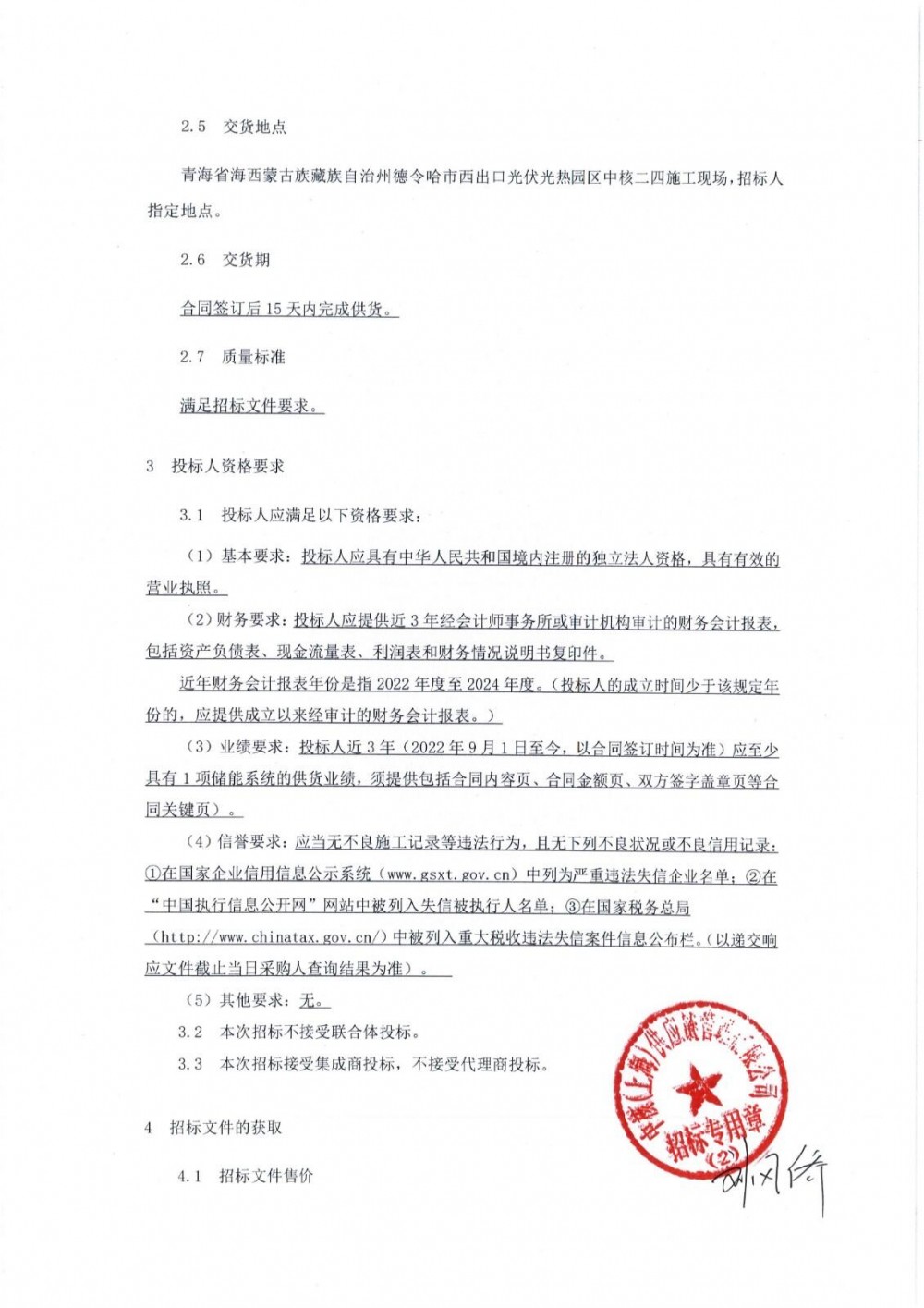 招标范围包括但不限于储能系统设备的检验、试验、包装、运输、交货、安装、调试及验收等相关内容,合同签订后15天内完成供货。