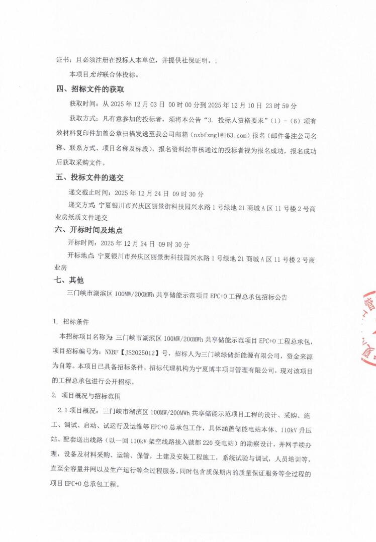 12月3日,三门峡市湖滨区100MW/200MWh共享储能示范项目EPC+O工程总承包招标公告发布。