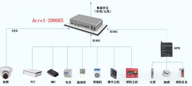 2.1 Acrel-2000ES,可通过直采或者通过通讯管理或串口服务器将储能柜或者储能集装箱内部的设备接入系统。系统结构如下: