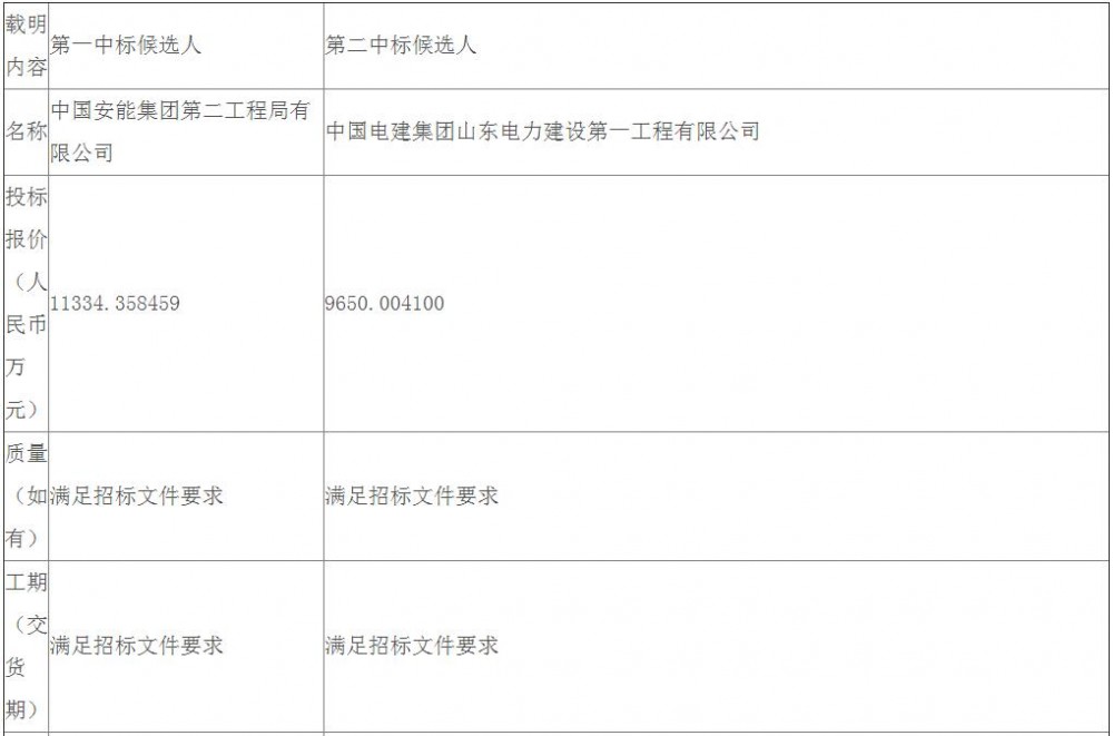 第一中标候选人为中国安能集团第二工程局有限公司,投标报价为113343584.59元,折合单价0.9445元/Wh;第二中标候选人为中国电建集团山东电力建设第一工程有限公司,投标报价为96500041元,折合单价0.8042元/Wh。
