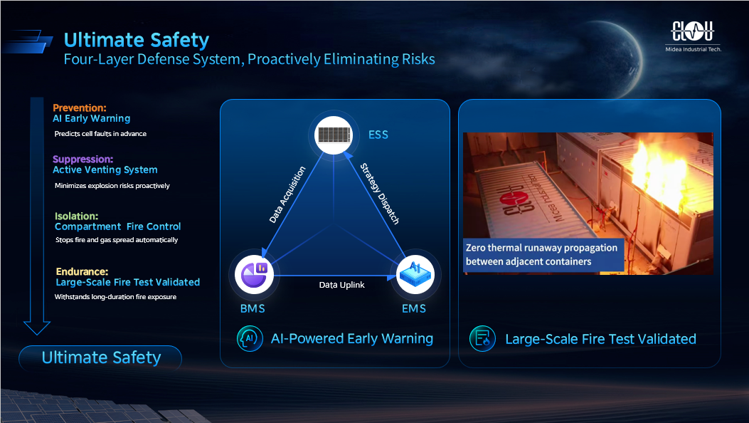 面对日本地震多发的地质特点,Aqua-C2.5系列满足IEEE 693高抗震标准,可轻松应对当地抗震及运输要求。系统还通过电芯故障告警、主动通风泄爆系统降低燃爆风险、独立分仓灭火,以及长时耐火3小时以上设计构建四级安全防御体系,保障系统极致安全。
