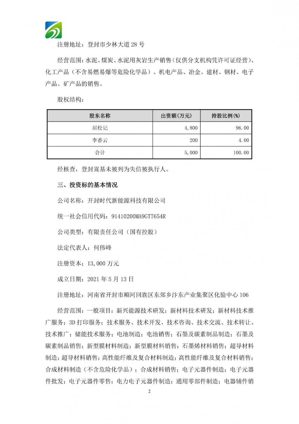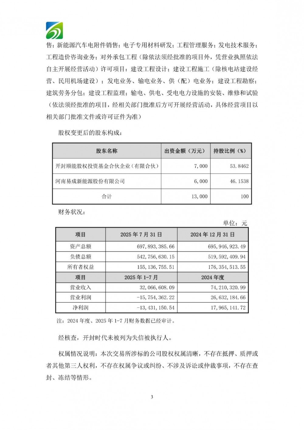12月11日,易成新能发布公告称,公司将以1,000万元收购登封市嵩基(集团)有限公司持有的开封时代新能源科技有限公司7.6923%股权,本次收购完成后,公司将持有开封时代46.1538%股权。