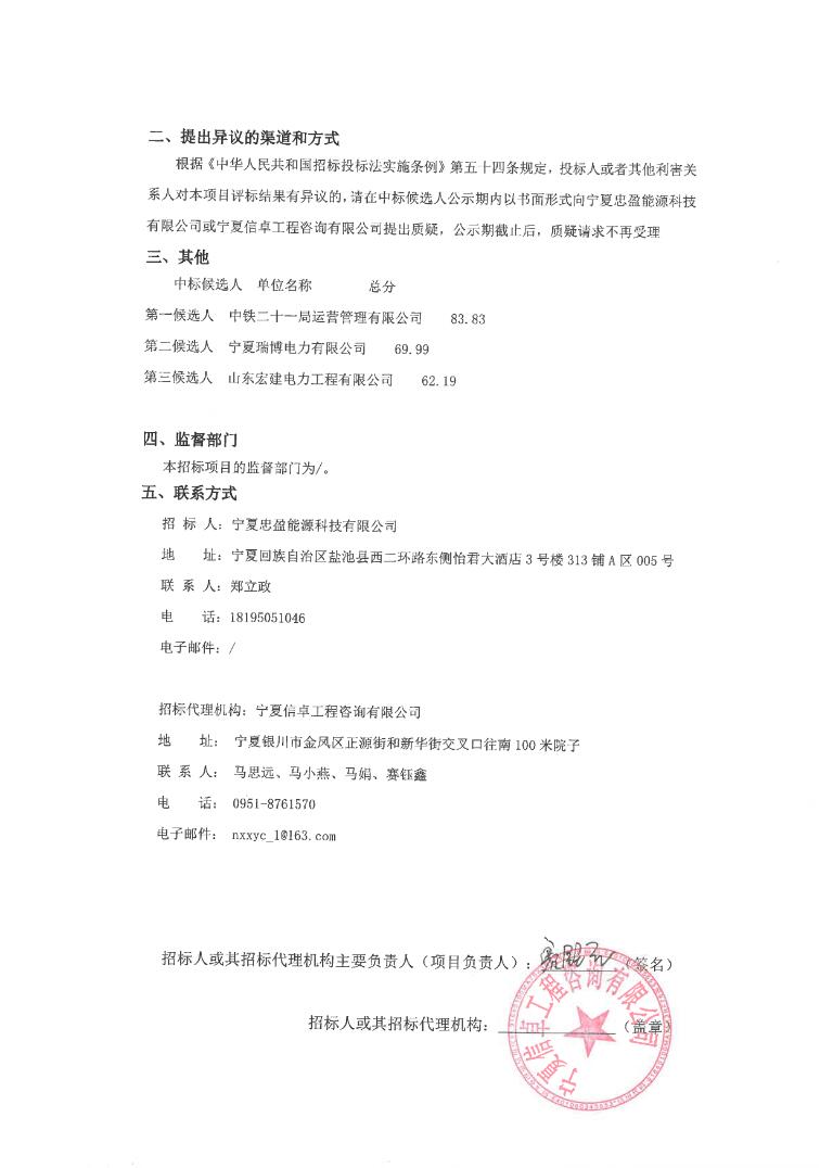 第一中标候选人为中铁二十一局集团运营管理有限公司,投标报价为430000000元,折合单价1.075元/Wh;第二中标候选人为宁夏瑞博电力有限公司,投标报价为392375000元,折合单价0.9809元/Wh;第三中标候选人为山东宏建电力工程有限公司,投标报价为478375000元,折合单价1.1959元/Wh。