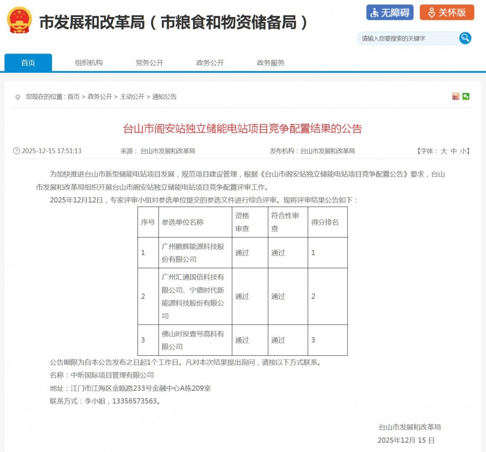 12月15日,广东江门市台山市发展和改革局发布《台山市阁安站独立储能电站项目竞争配置结果的公告》,结果显示,广州鹏辉能源科技股份有限公司、广州汇通国信科技有限公司和宁德时代新能源科技股份有限公司、佛山时投壹号高科有限公司入围,分别得分排第1、第2、第3名。