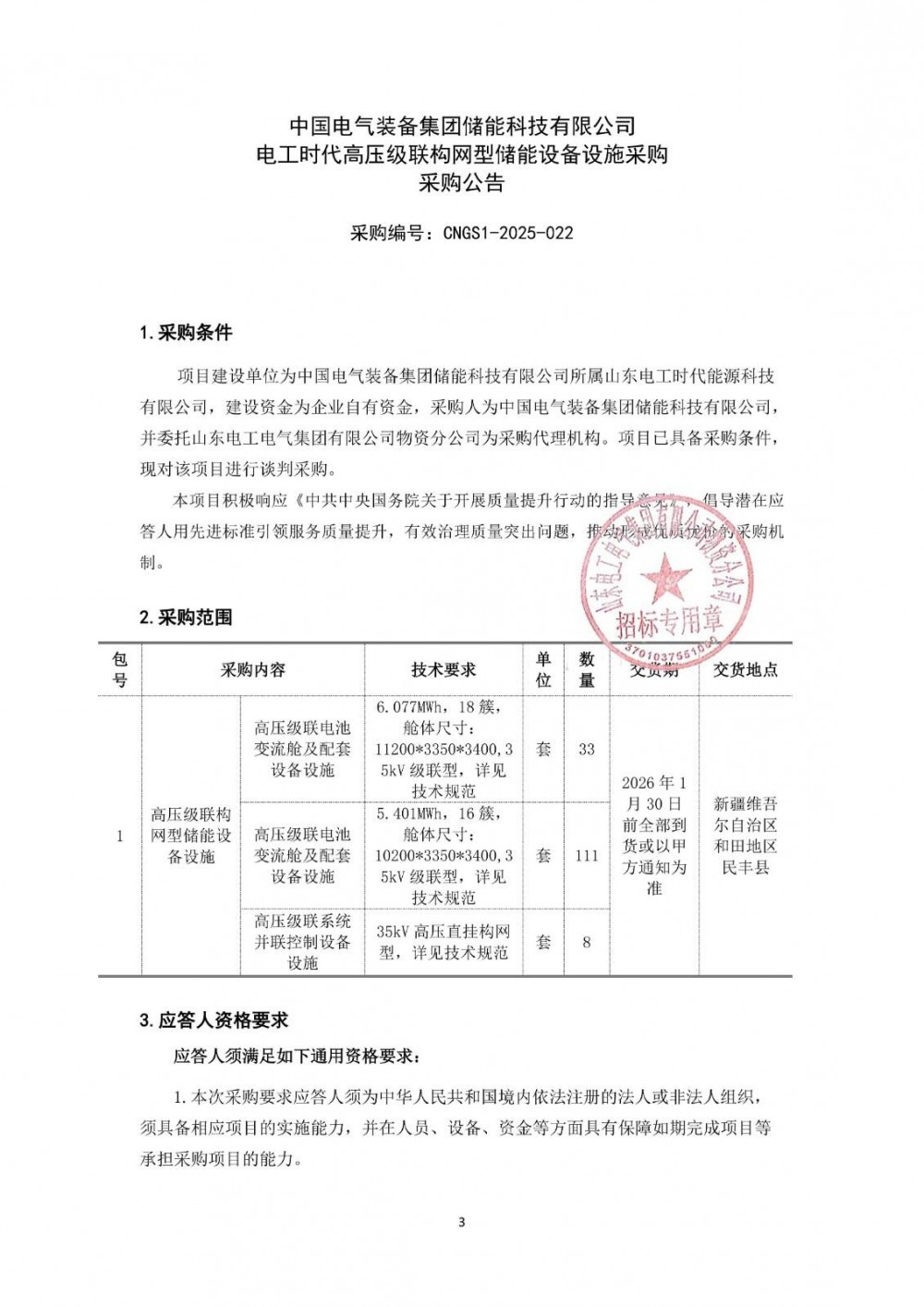12月13日,中国电气装备集团储能科技有限公司电工时代高压级联构网型储能设备设施采购采购公告发布。项目共采购高压级联构网型储能设备约800MWh,其中规模为6.077MWh的设备33套、规模为200.541MWh,规模为5.401MWh的设备111套、规模为599.511MWh。