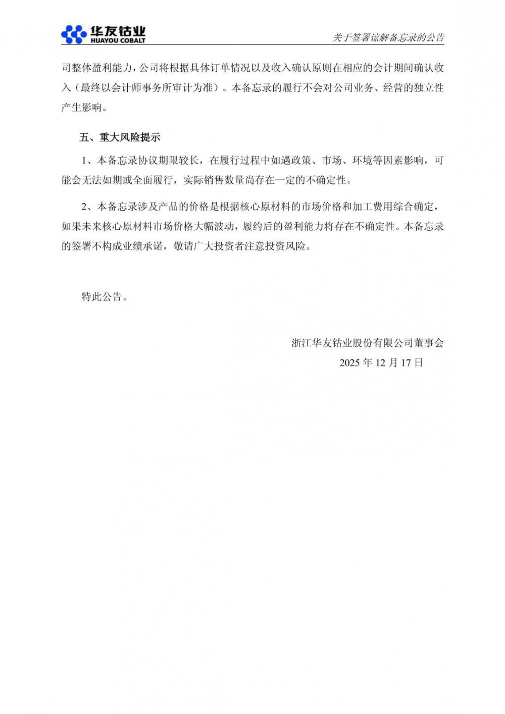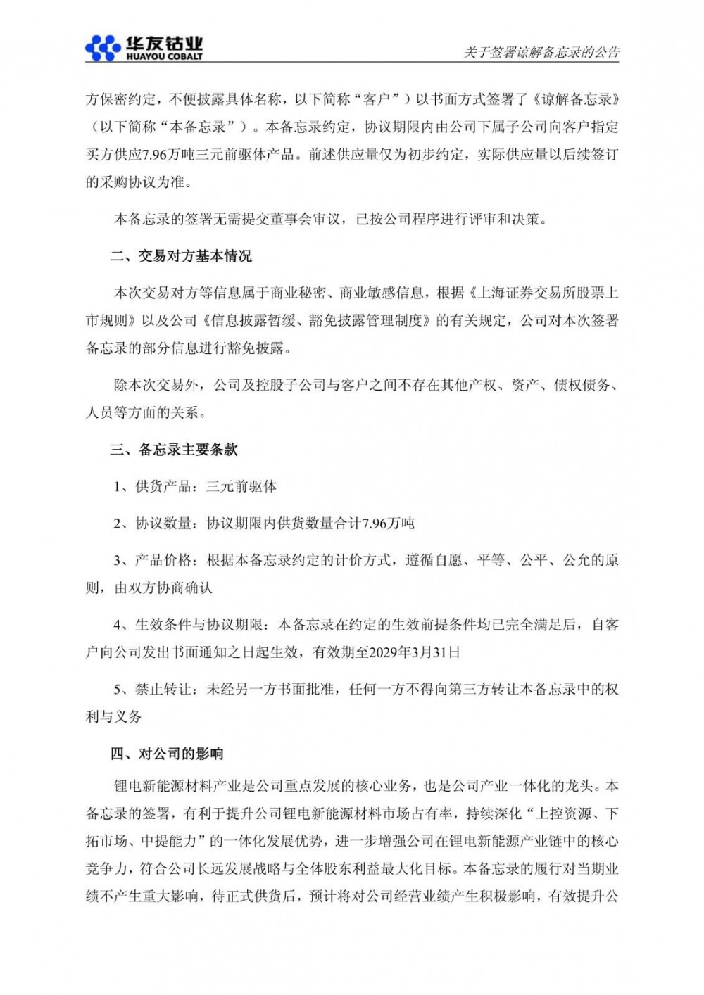 华友钴业表示,锂电新能源材料产业是公司重点发展的核心业务,也是公司产业一体化的龙头。本备忘录的签署,有利于提升公司锂电新能源材料市场占有率,持续深化“上控资源、下拓市场、中提能力”的一体化发展优势,进一步增强公司在锂电新能源产业链中的核心竞争力,符合公司长远发展战略与全体股东利益最大化目标。本备忘录的履行对当期业绩不产生重大影响,待正式供货后,预计将对公司经营业绩产生积极影响,有效提升公司整体盈利能力,公司将根据具体订单情况以及收入确认原则在相应的会计期间确认收入(最终以会计师事务所审计为准)。本备忘录的履行不会对公司业务、经营的独立性产生影响。