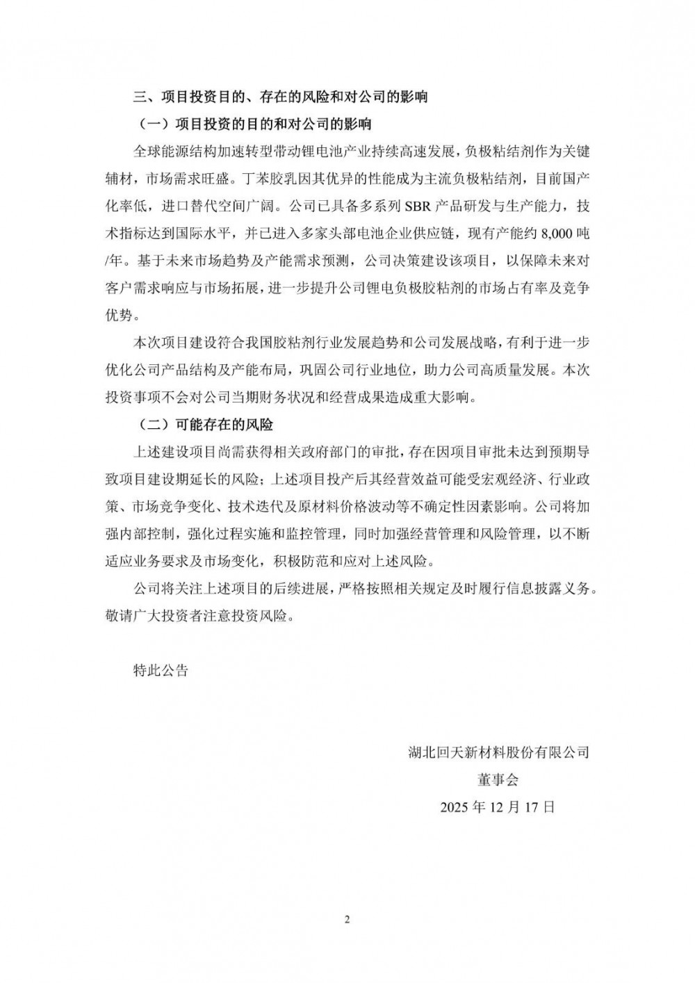 12月16日,回天新材发布公告称,基于锂电池行业快速增长的市场需求,为紧抓国产替代机遇,进一步提升在锂电负极胶粘剂领域的市场份额与核心竞争力,湖北回天新材料股份有限公司控股子公司安庆华兰科技有限公司拟以自筹资金约9,768万元投资新建锂电负极用丁苯乳液粘合剂项目,增加锂电负极用丁苯乳液粘合剂(SBR)产能约50,000吨/年。