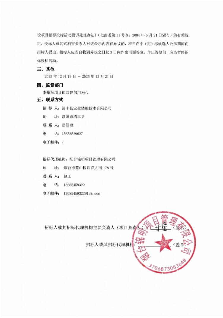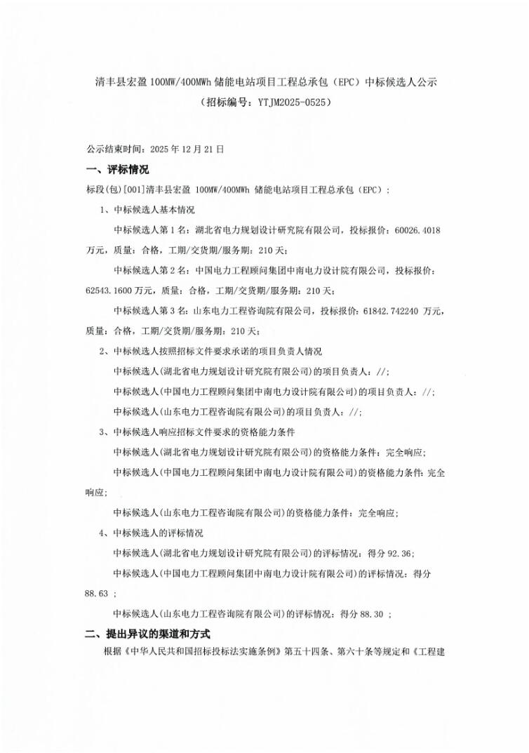 12月18日,清丰县宏盈100MW/400MWh储能电站项目工程总承包(EPC)中标候选人公示。