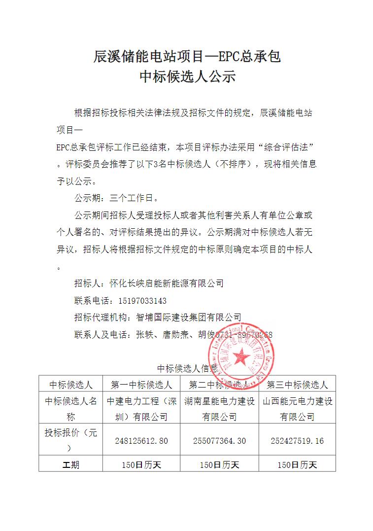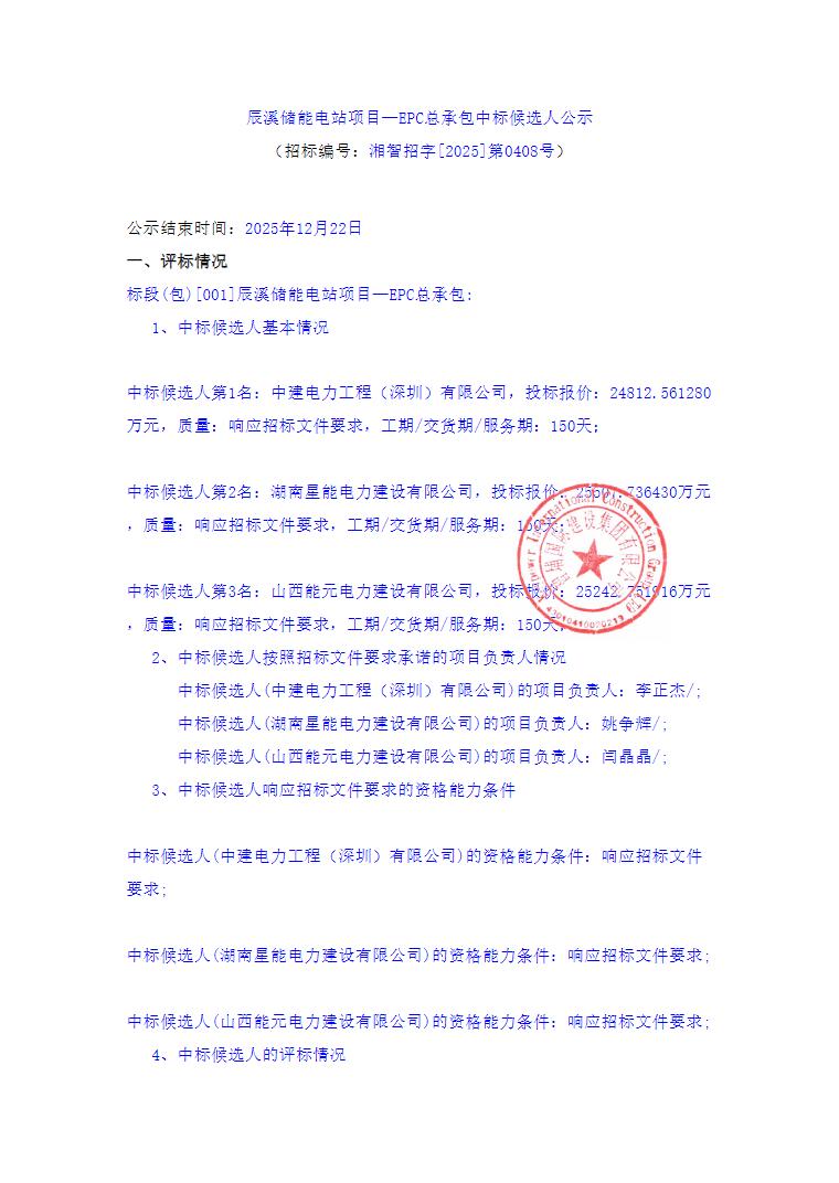 12月18日,辰溪储能电站项目—EPC总承包中标候选人公示。