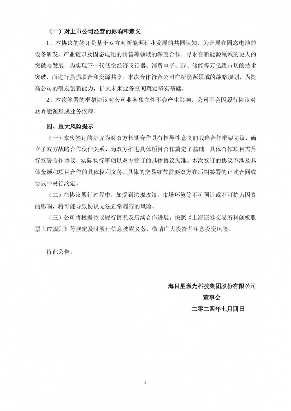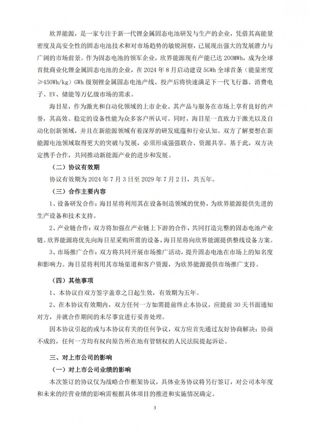 海目星表示,本协议的签订是基于双方对新能源行业发展的共同认知,为开展在固态电池的设备研发、产业链以及固态电池的销售等领域的深度合作,寻求在新能源领域的更大的突破与发展,为实现下一代低空经济飞行器、消费电子、EV、储能等万亿级市场的技术突破,而进行强强联合和资源共享。本次合作符合公司在新能源领域的战略规划,为提高公司的研发创新能力,扩大未来业务空间奠定坚实基础。