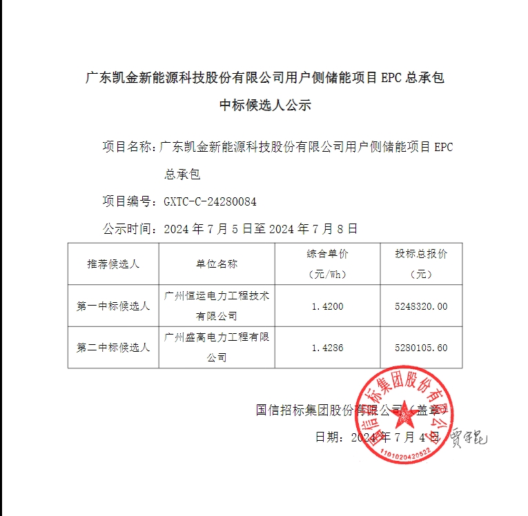 据储能界了解到,7月4日,广东凯金新能源科技股份有限公司用户侧储能项目EPC总承包中标候选人公示。