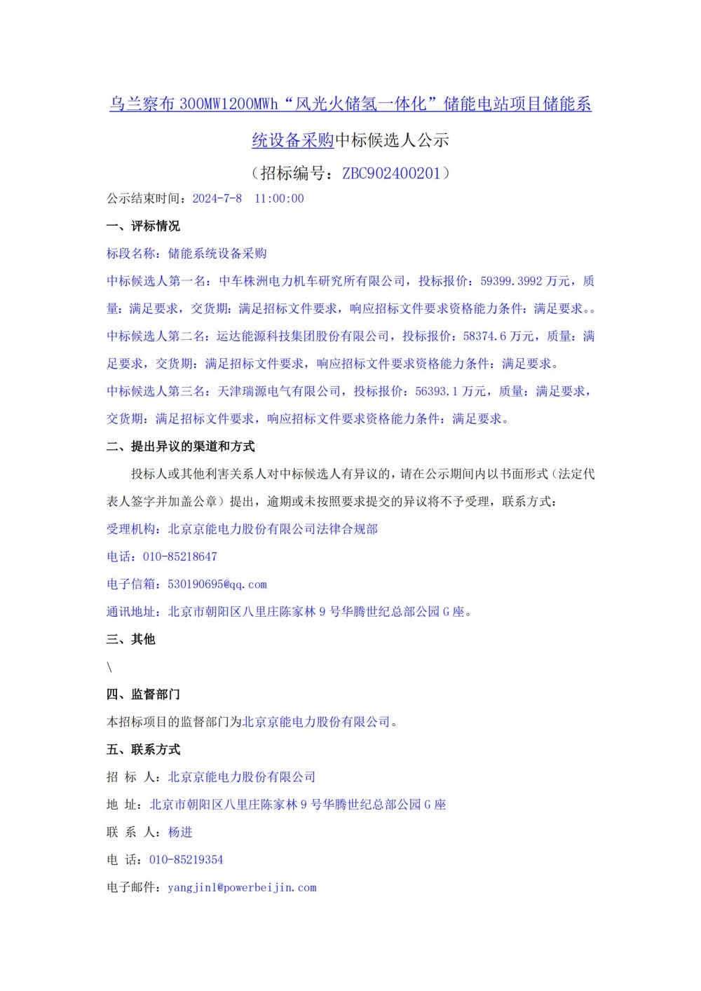 第一中标候选人为中车株洲电力机车研究所有限公司,投标报价59399.3992万元,折合单价0.495元/Wh;第二中标候选人为运达能源科技集团股份有限公司,投标报价58374.6万元,折合单价0.486元/Wh;第三中标候选人为天津瑞源电气有限公司,投标报价56393.1万元,折合单价0.47元/Wh。
