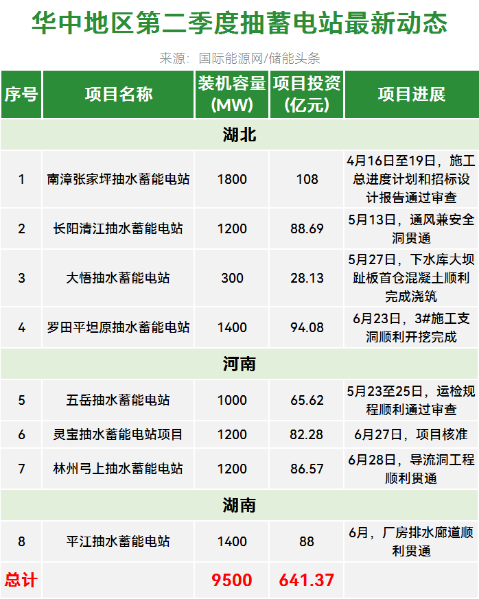 华中地区有8个抽水蓄能电站更新了动态,装机总规模为9.5GW,项目总投资641.37亿元。