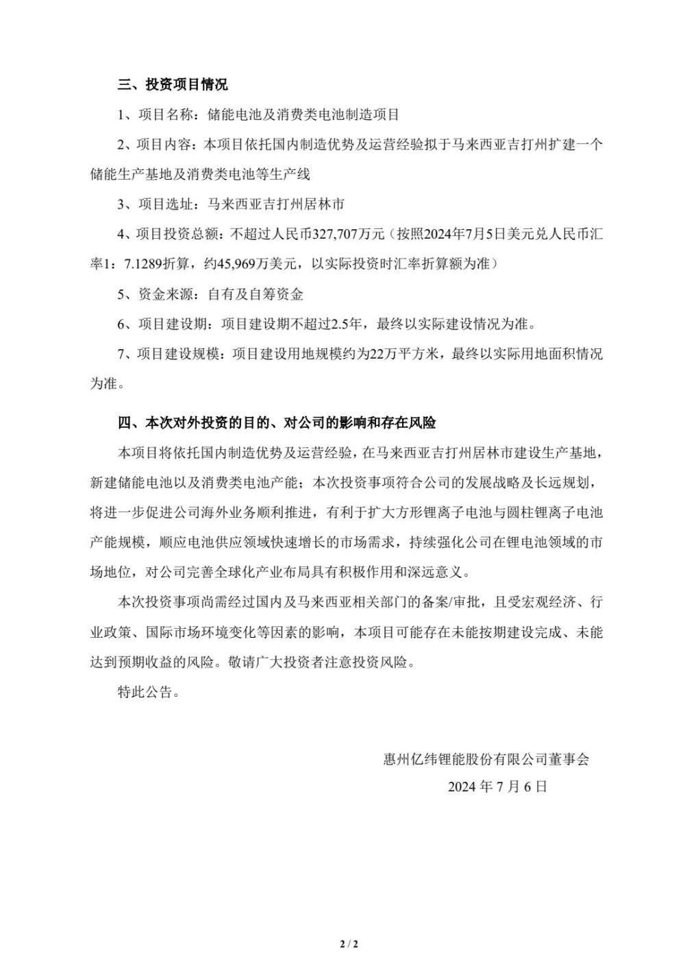 公告内容指出,惠州亿纬锂能股份有限公司于2024年7月5日召开的第六届董事会第三十六次会议审议通过了《关于孙公司拟在马来西亚投资建设储能电池及消 费类电池制造项目的议案》,同意公司全资孙公司亿纬锂能马来西亚有限公司以自有 及自筹资金投资建设储能电池及消费类电池制造项目,投资金额不超过人民币327,707万元。
