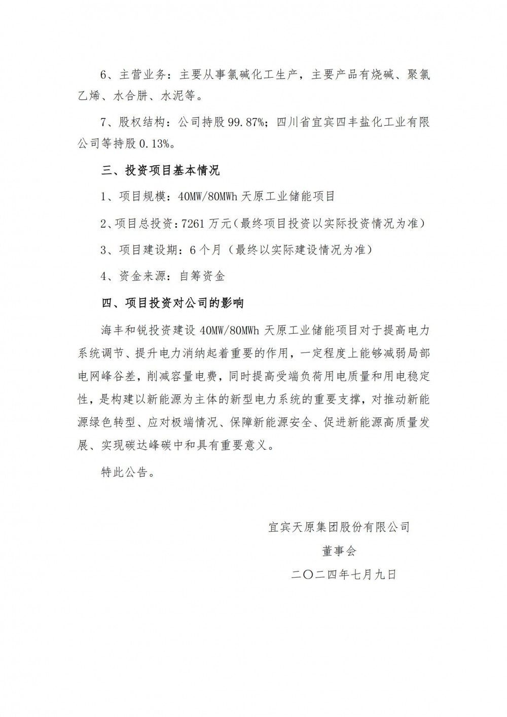 据储能界了解到,7月8日,天原股份发布公告称,为稳定电网运行,助力实现“双碳”目标,宜宾天原集团股份有限公司以控股子公司宜宾海丰和锐有限公司(简称:海丰和锐)为项目投资主体,投资7261万元,在原海丰和锐变电站围墙内空地建设40MW/80WWh用户侧电化学储能电站。
