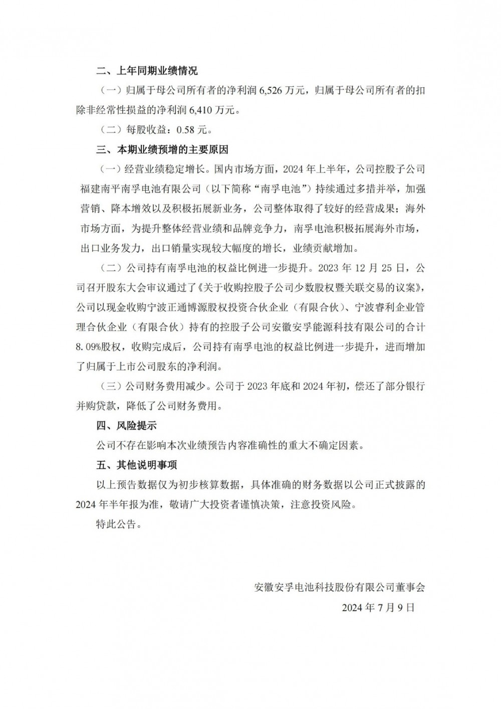 据储能界了解到,7月8日,安孚科技发布公告称,公司预计2024年半年度实现归属于母公司所有者的净利润8500万元到10000万元,与上年同期相比,将增加1974万元到3474万元,同比增加30.25%到53.23%;预计2024年半年度实现归属于母公司所有者的扣除非经常性损益的净利润8300万元到9800万元,与上年同期相比,将增加1890万元到3390万元,同比增加29.49%到52.89%。