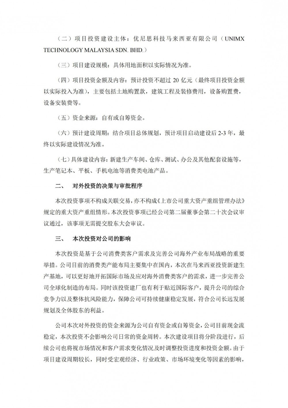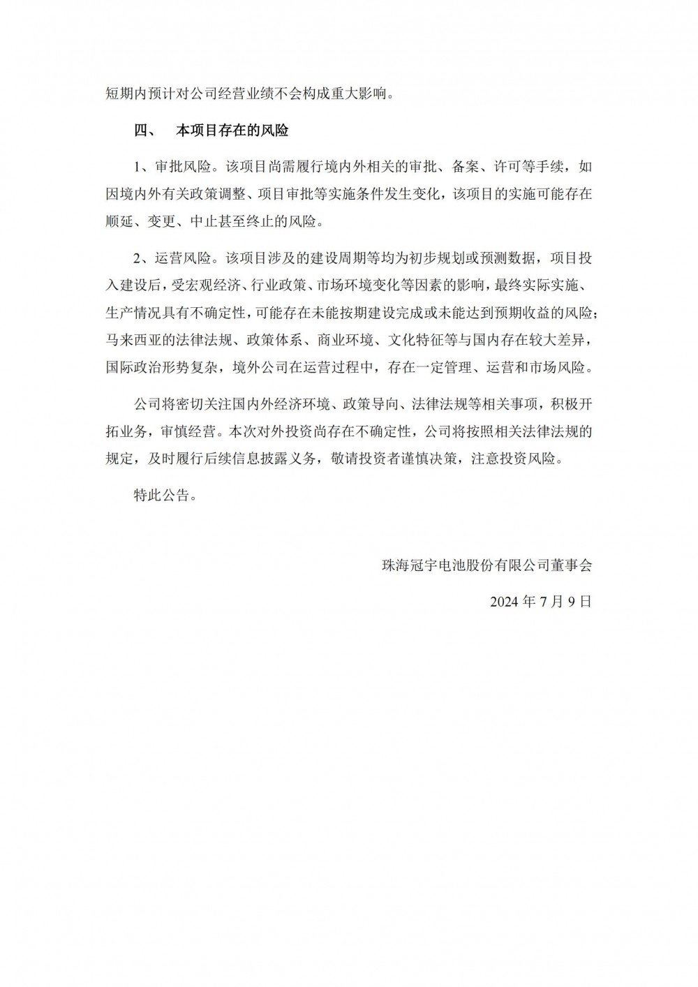 据储能界了解到,7月8日,珠海冠宇发布公告称,基于珠海冠宇电池股份有限公司(以下简称“公司”)消费类客户需求及完善公司海外产业布局战略的需要,公司在马来西亚的全资子公司优尼思科技马来西亚有限公司拟投资建设马来西亚冠宇电池新能源项目(最终项目名称以实际备案名称为准),总投资额预计不超过人民币20亿元(最终项目投资总额以实际投资为准)。